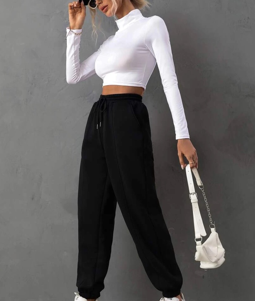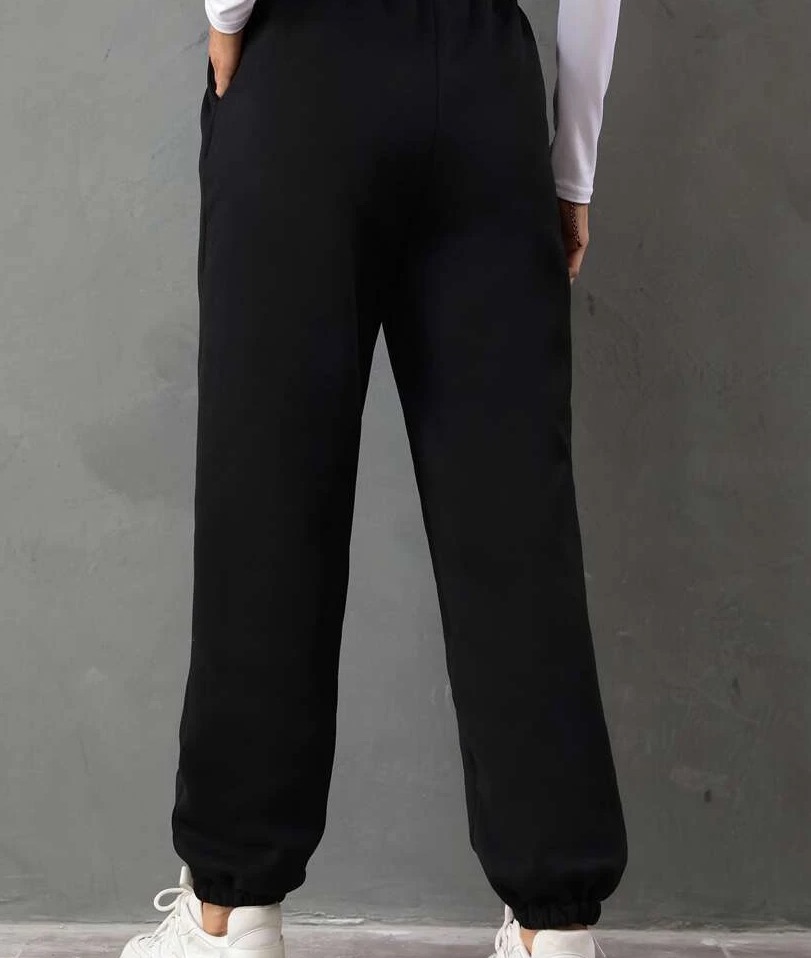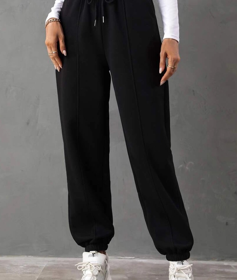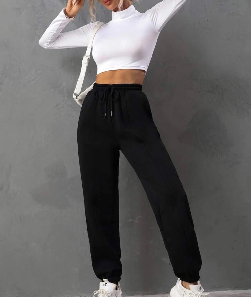 Color: Black Pattern Type: Plain Type: Jogger Waist Line: High Waist Details: Pocket, Drawstring Length: Long Closure Type: Drawstring Waist Fit Type: Regular Fit