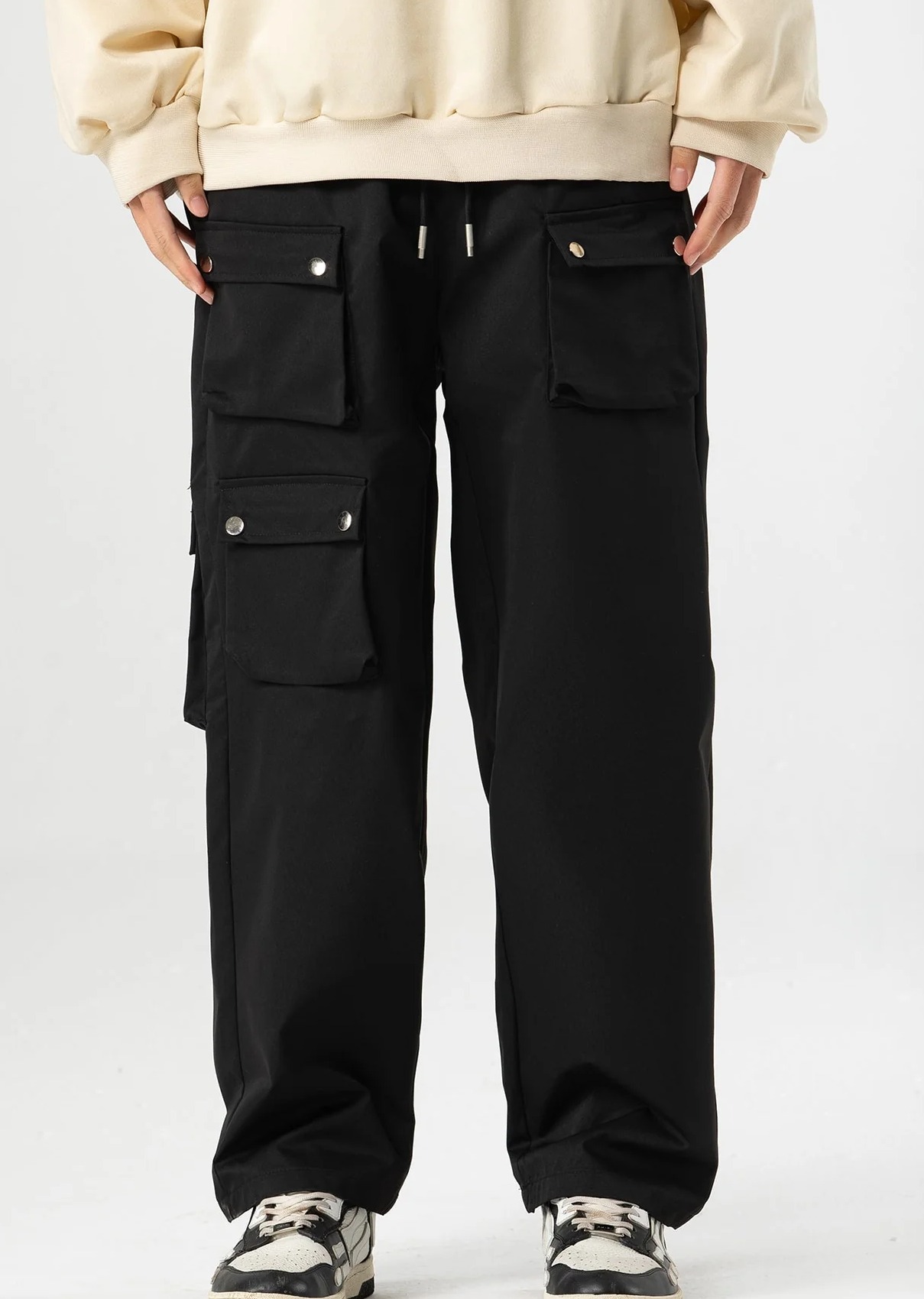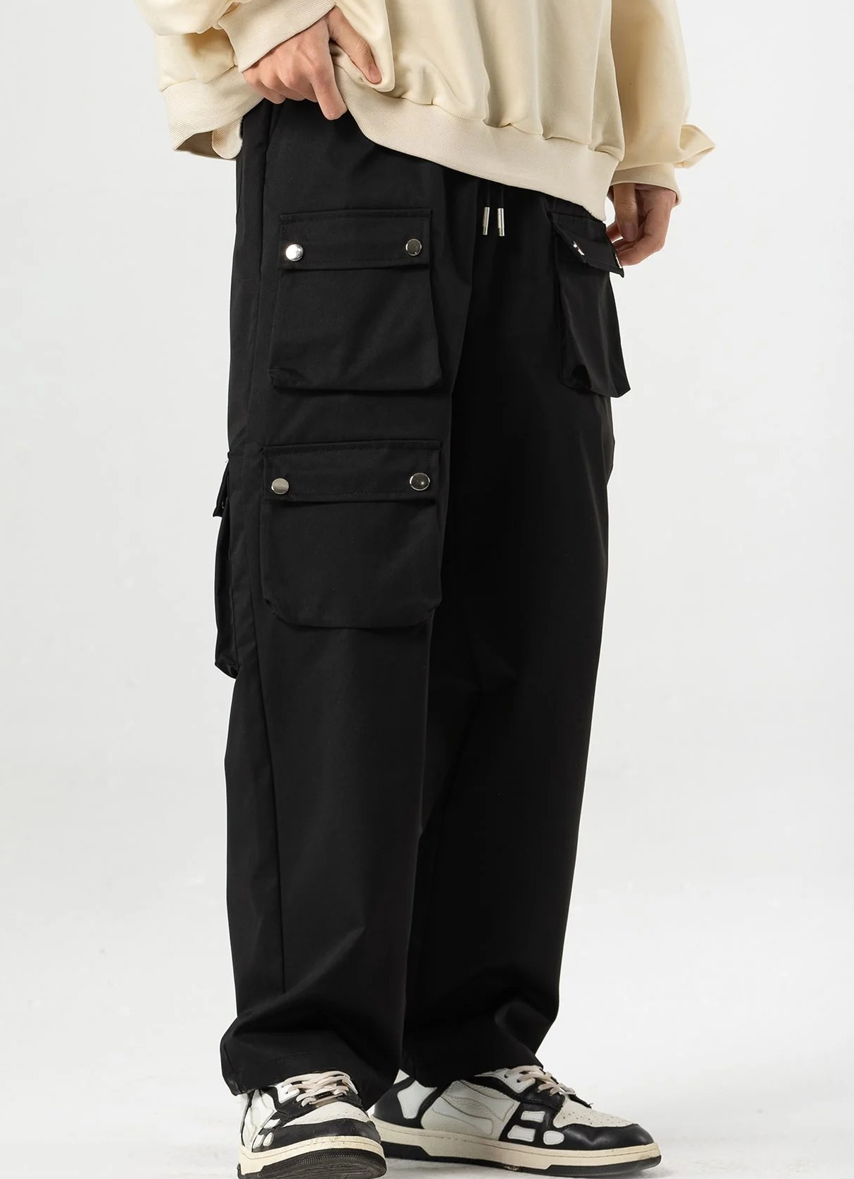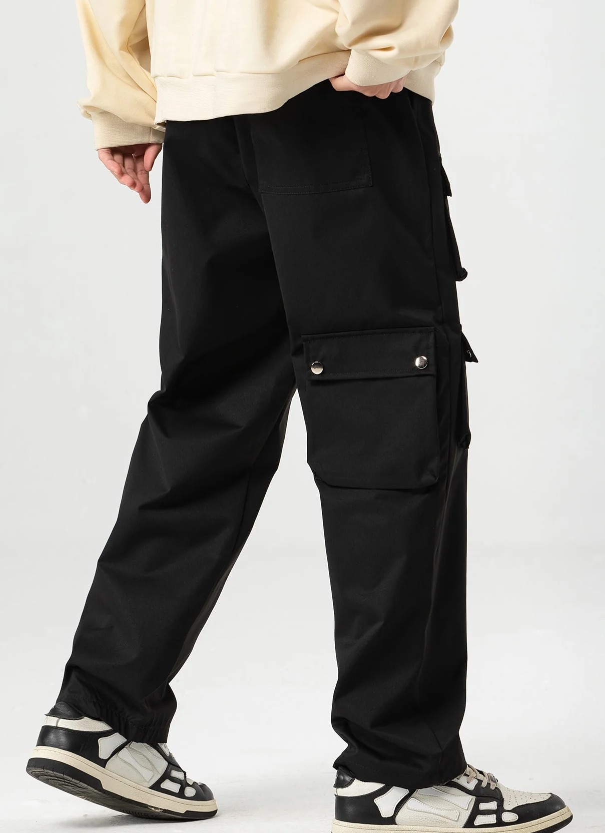 Color: Black Details: Drawstring, Pocket Closure Type: Drawstring Waist Fabric: Non-Stretch Length: Long Fit Type: Loose Waist Line: Natural Sheer: No Pattern Type: Plain Composition: Polyester Style: Street Location: All Type: Cargo Pants Fabric Type: Woven Body: Unlined Care Instructions: Machine wash or professional dry clean Material: Woven Fabric
