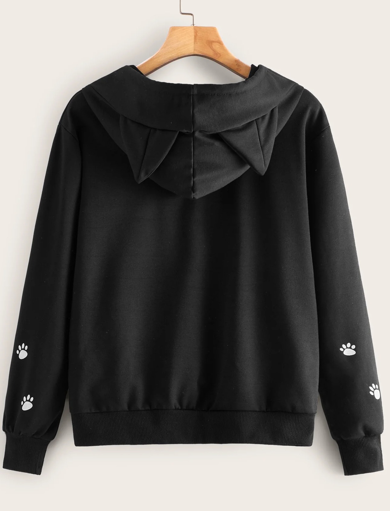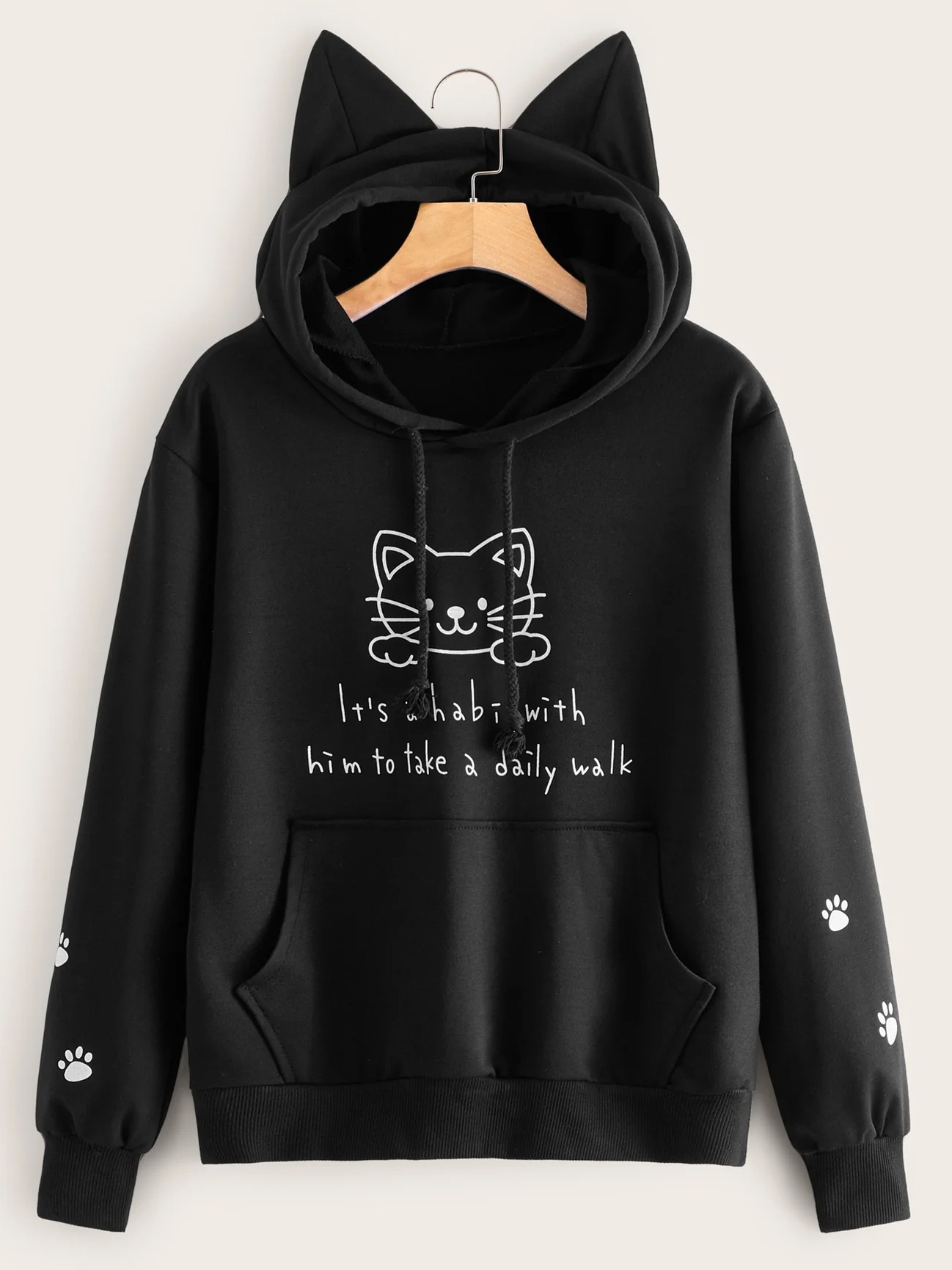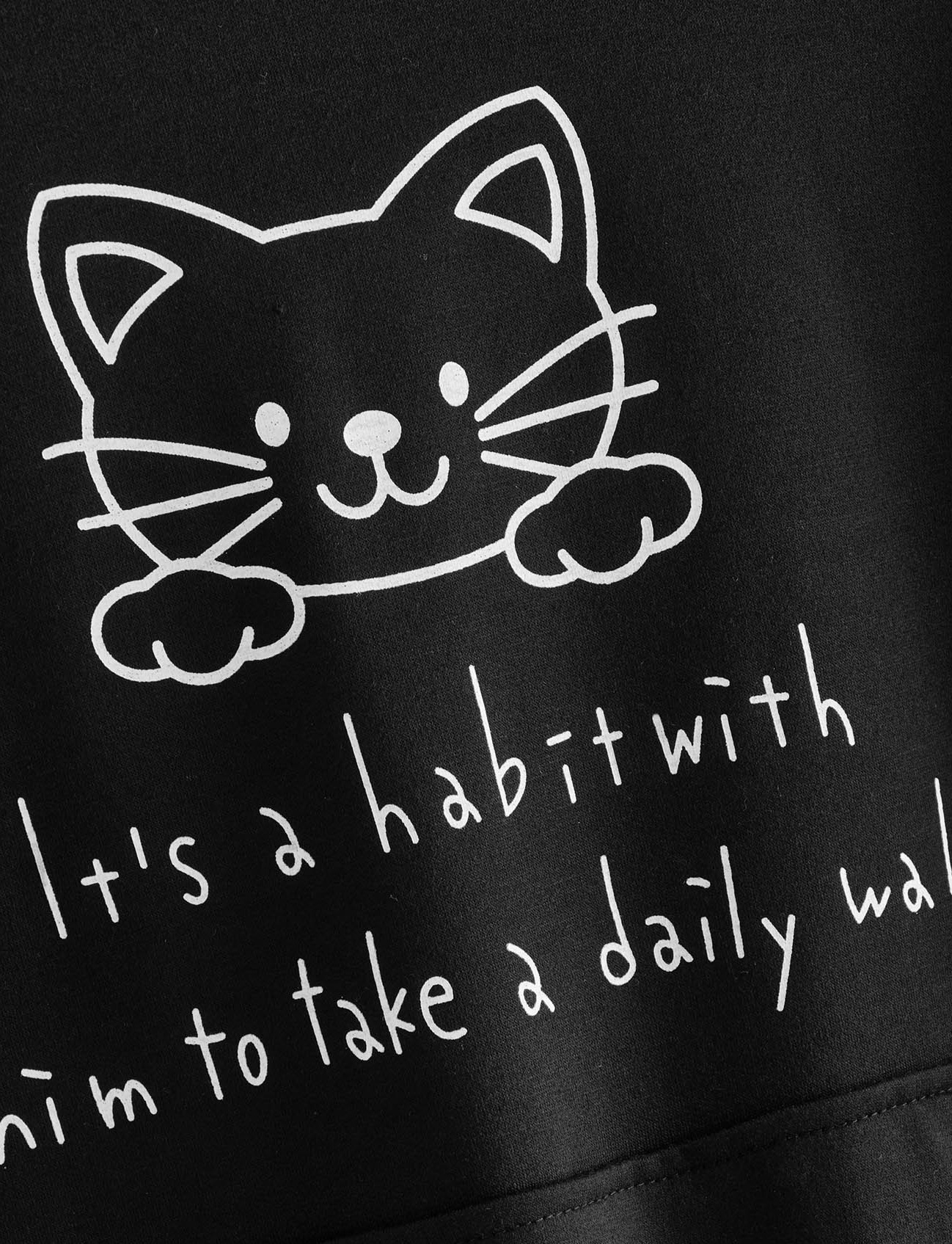 Cat & Slogan Graphic Kangaroo Pocket Hoodie
