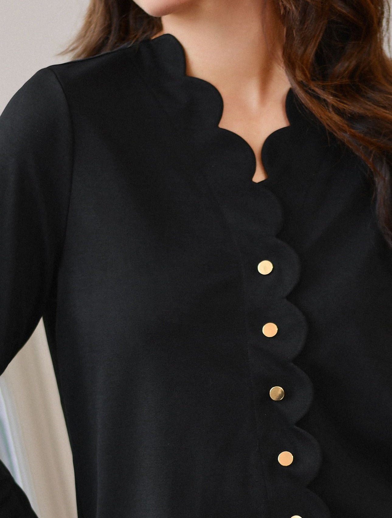 Color: Black Style: Casual Composition: Elastane, Polyester Sleeve Length: Long Sleeve Sheer: No Pattern Type: Plain Lining: Polyester Length: Regular Fit Type: Regular Fit Details: Scallop, Button Front Neckline: V neck Sleeve Type: Regular Sleeve Placket Type: Placket Location: FR Fabric Type: Knitting Fabric: Medium Stretch Care Instructions: Machine wash or professional dry clean Material: Knitted Fabric