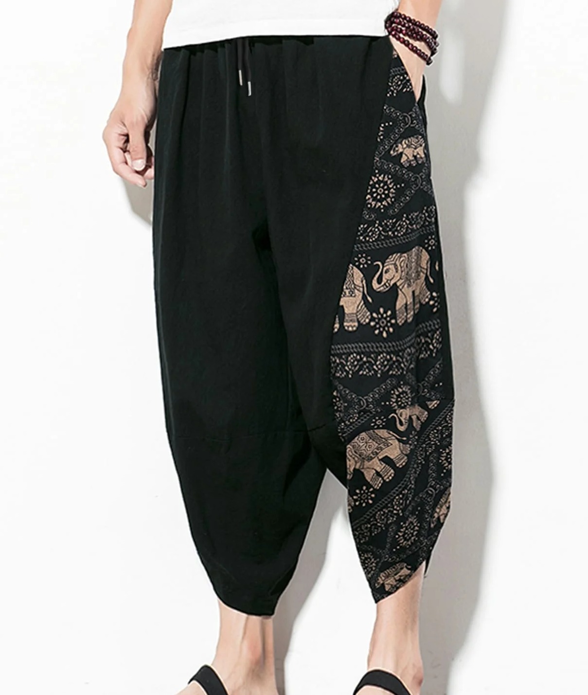 Pattern Type: Animal, Graphic Color: Black Length: Capris Details: Drawstring Closure Type: Drawstring Waist Material: Fabric Fabric: Non-Stretch Type: Harem/Genie Fit Type: Loose Waist Line: Natural Sheer: No Composition: Polyester Season: Summer Style: Boho Location: All Fabric Type: Woven Body: Unlined Care Instructions: Machine wash or professional dry clean