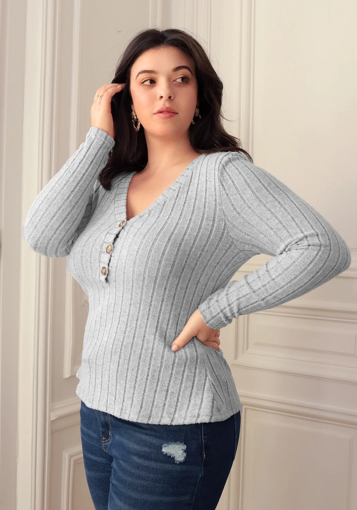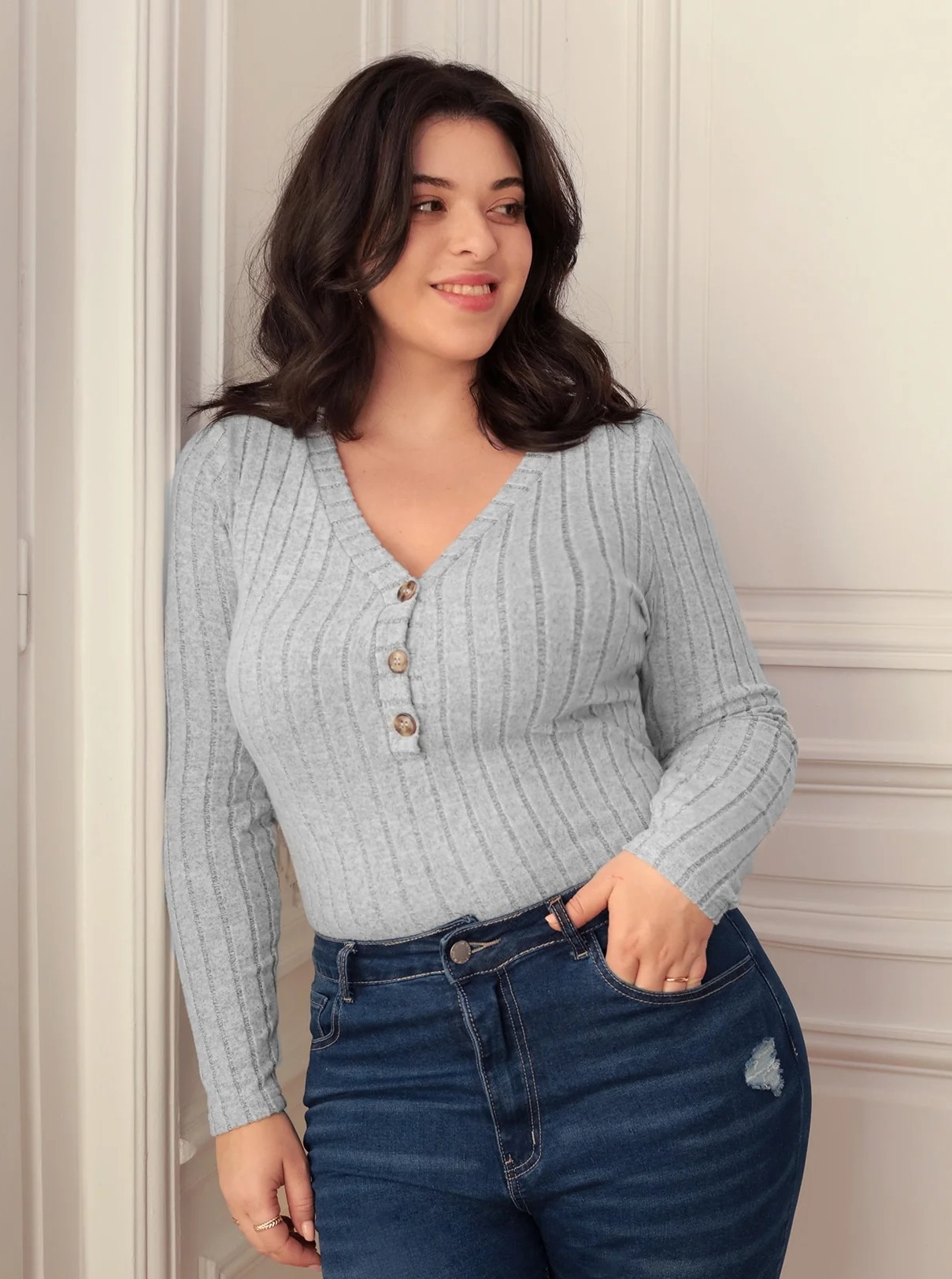 Style: Casual Composition: Elastane, Polyester Fabric: Slight Stretch Sleeve Length: Long Sleeve Sheer: No Pattern Type: Plain Placket Type: Pullovers Length: Regular Fit Type: Slim Fit Neckline: V neck Sleeve Type: Regular Sleeve Details: Rib-Knit, Button Front Location: FR Color: Light Grey Fabric Type: Knitting Care Instructions: Machine wash or professional dry clean Material: Knitted Fabric