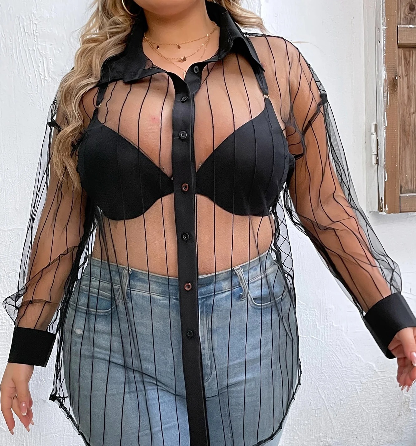 Color: Black Neckline: Collar Composition: Elastane, Polyester Material: Fabric Fabric: Non-Stretch Length: Long Sleeve Length: Long Sleeve Pattern Type: Plain Fit Type: Regular Fit Style: Sexy Details: Sheer, Button Front Type: Shirt Sheer: Yes Location: All Sleeve Type: Drop Shoulder Fabric Type: Woven Care Instructions: Machine wash or professional dry clean