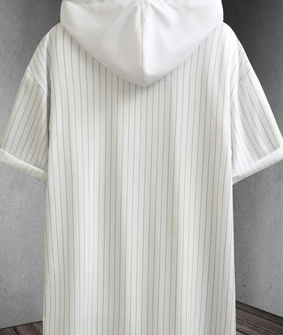 Style: Casual Details: Drawstring, Button Front Material: Fabric Fabric: Slight Stretch Neckline: Hooded Sheer: No Composition: Polyester Length: Regular Fit Type: Regular Fit Type: Shirt Sleeve Length: Short Sleeve Placket: Single Breasted Pattern Type: Striped Color: White Placket Type: Placket Location: All Sleeve Type: Drop Shoulder Fabric Type: Woven Care Instructions: Machine wash or professional dry clean
