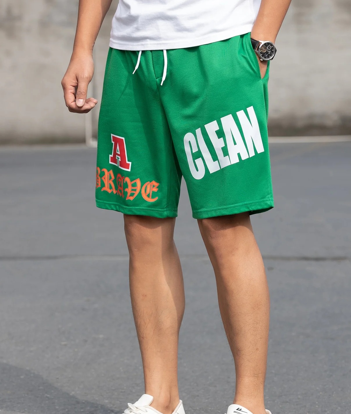 Style: Casual Details: Drawstring Closure Type: Drawstring Waist Material: Fabric Fabric: Slight Stretch Color: Green Pattern Type: Letter Waist Line: Natural Sheer: No Composition: Polyester Fit Type: Regular Fit Length: Short Type: Track Shorts Location: All Fabric Type: Knitting Care Instructions: Machine wash or professional dry clean