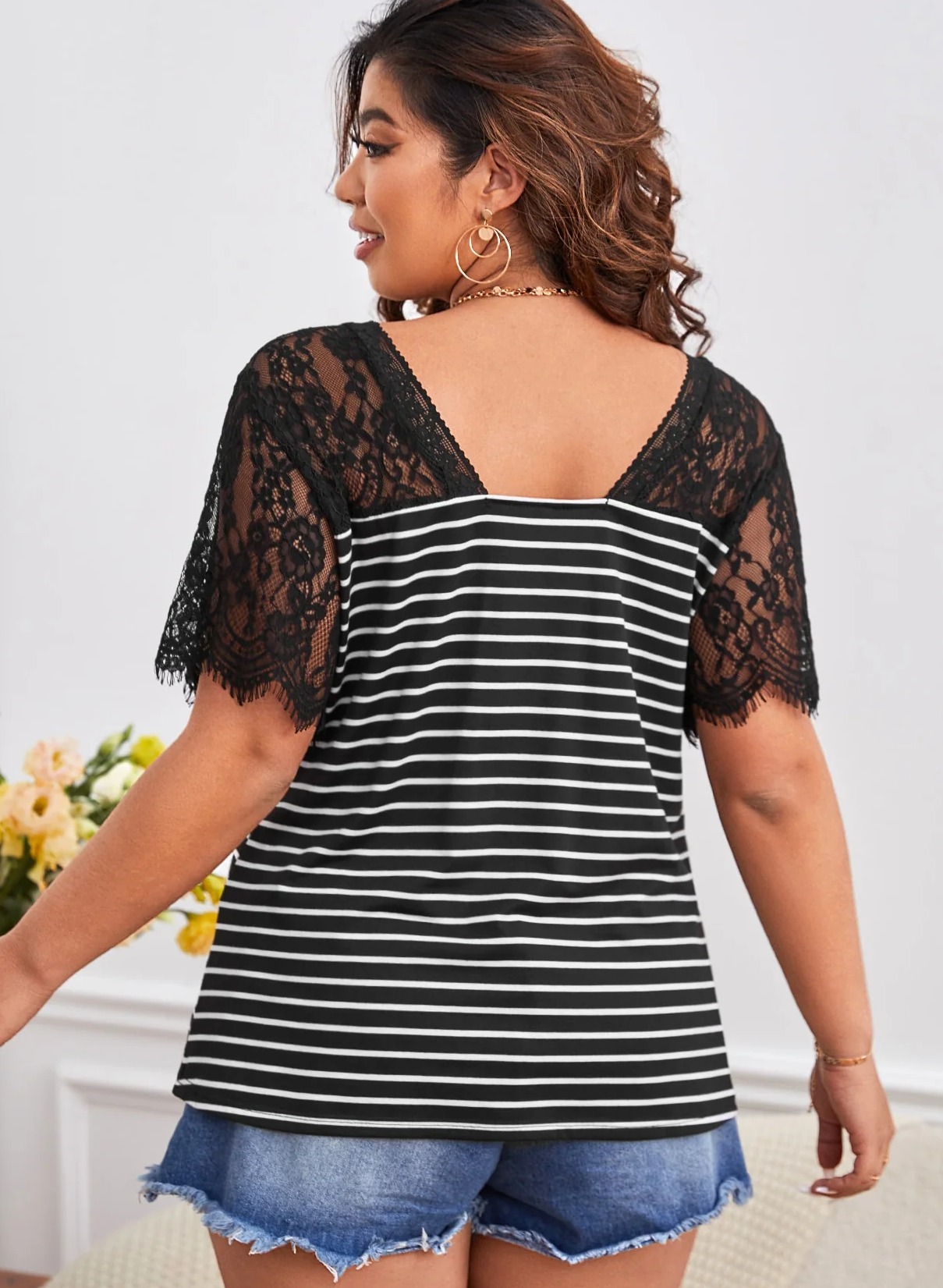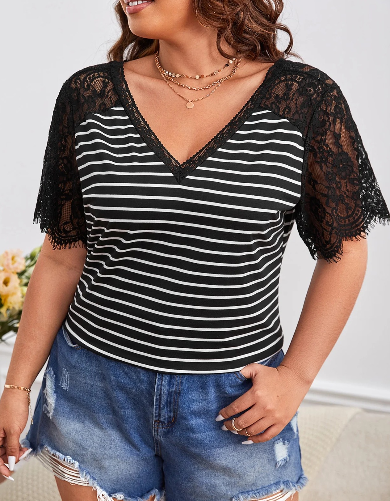Style: Casual Details: Contrast Lace Fabric: Slight Stretch Color: Multicolor Sheer: No Composition: Polyester Placket Type: Pullovers Length: Regular Fit Type: Regular Fit Sleeve Length: Short Sleeve Pattern Type: Striped Neckline: V neck Sleeve Type: Regular Sleeve Location: All Fabric Type: Knitting Care Instructions: Machine wash or professional dry clean Material: Knitted Fabric