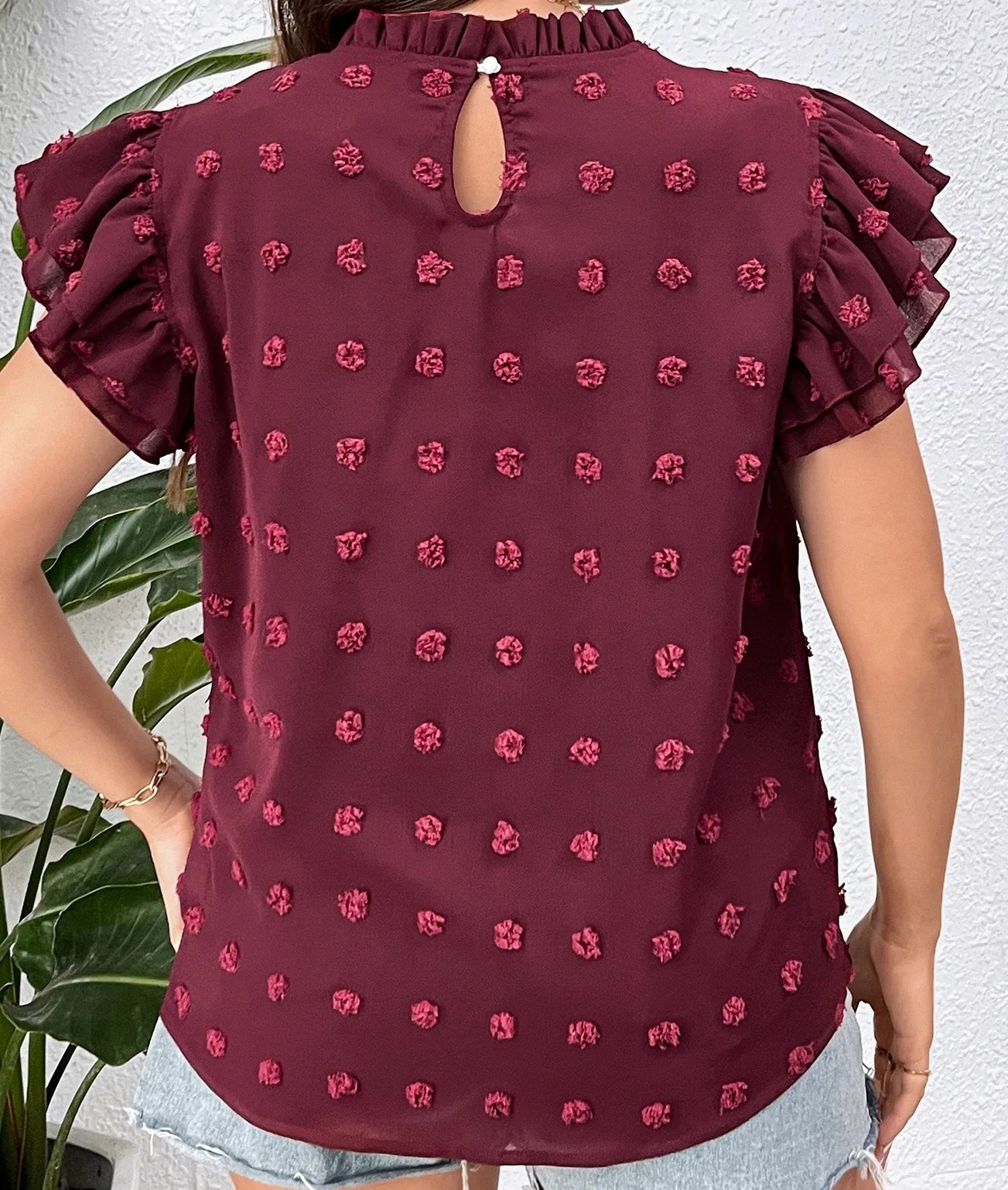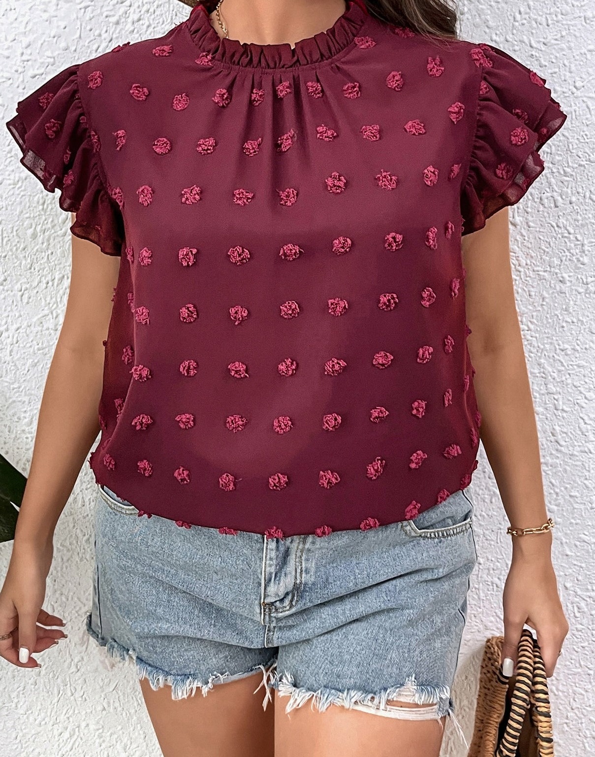 Color: Burgundy Sleeve Type: Butterfly Sleeve Sleeve Length: Cap Sleeve Style: Casual Material: Fabric Fabric: Non-Stretch Details: Frill, Ruffle Sheer: No Pattern Type: Plain Composition: Polyester Placket Type: Pullovers Length: Regular Fit Type: Regular Fit Neckline: Stand Collar Type: Top Location: All Fabric Type: Woven Care Instructions: Machine wash or professional dry clean