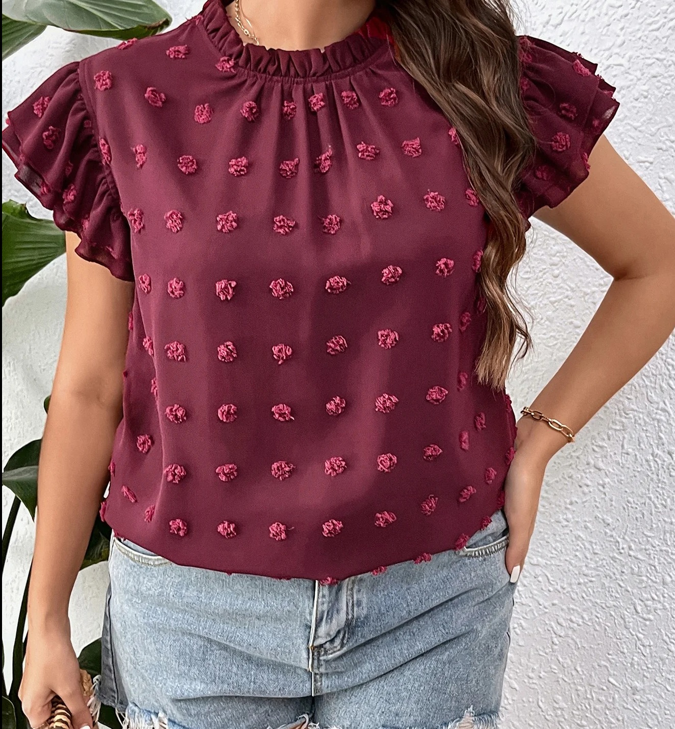 Plus Swiss Dot Butterfly Sleeve Frilled Neck Blouse
