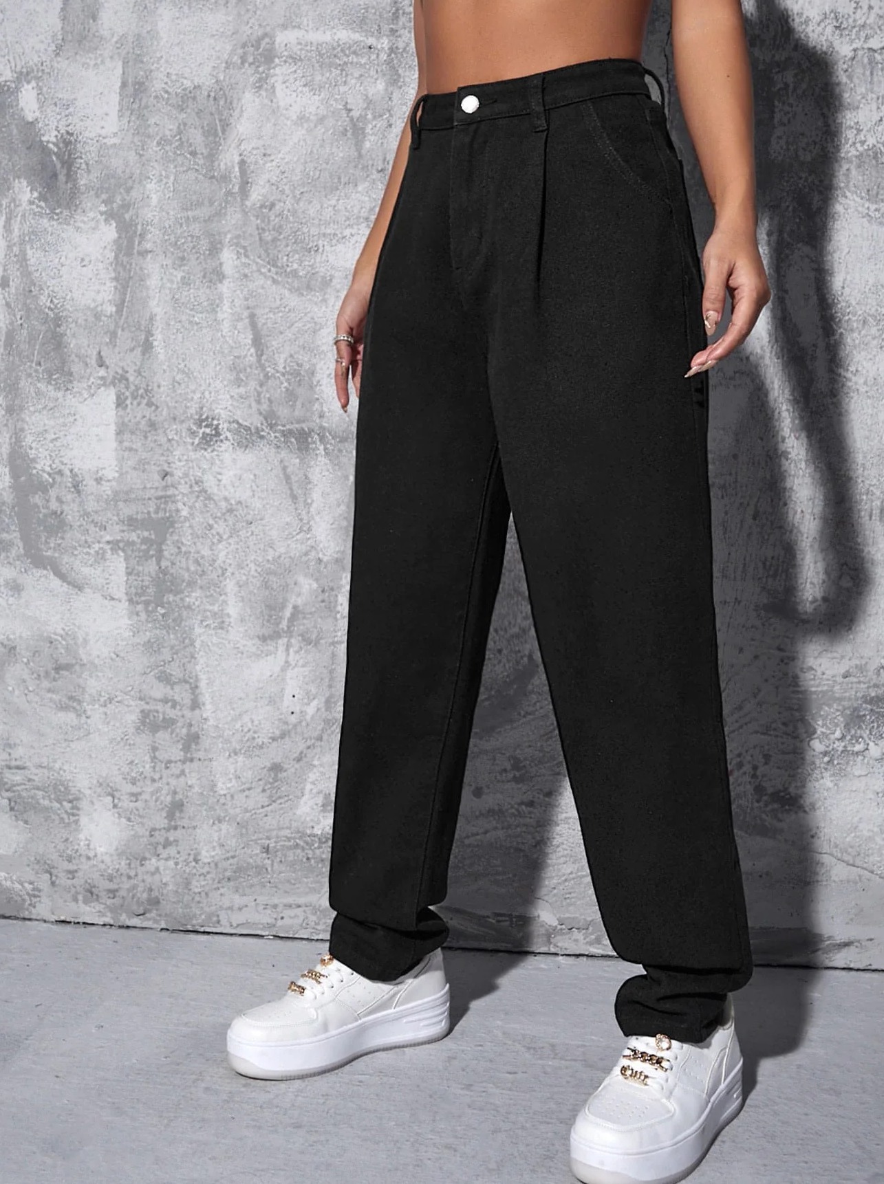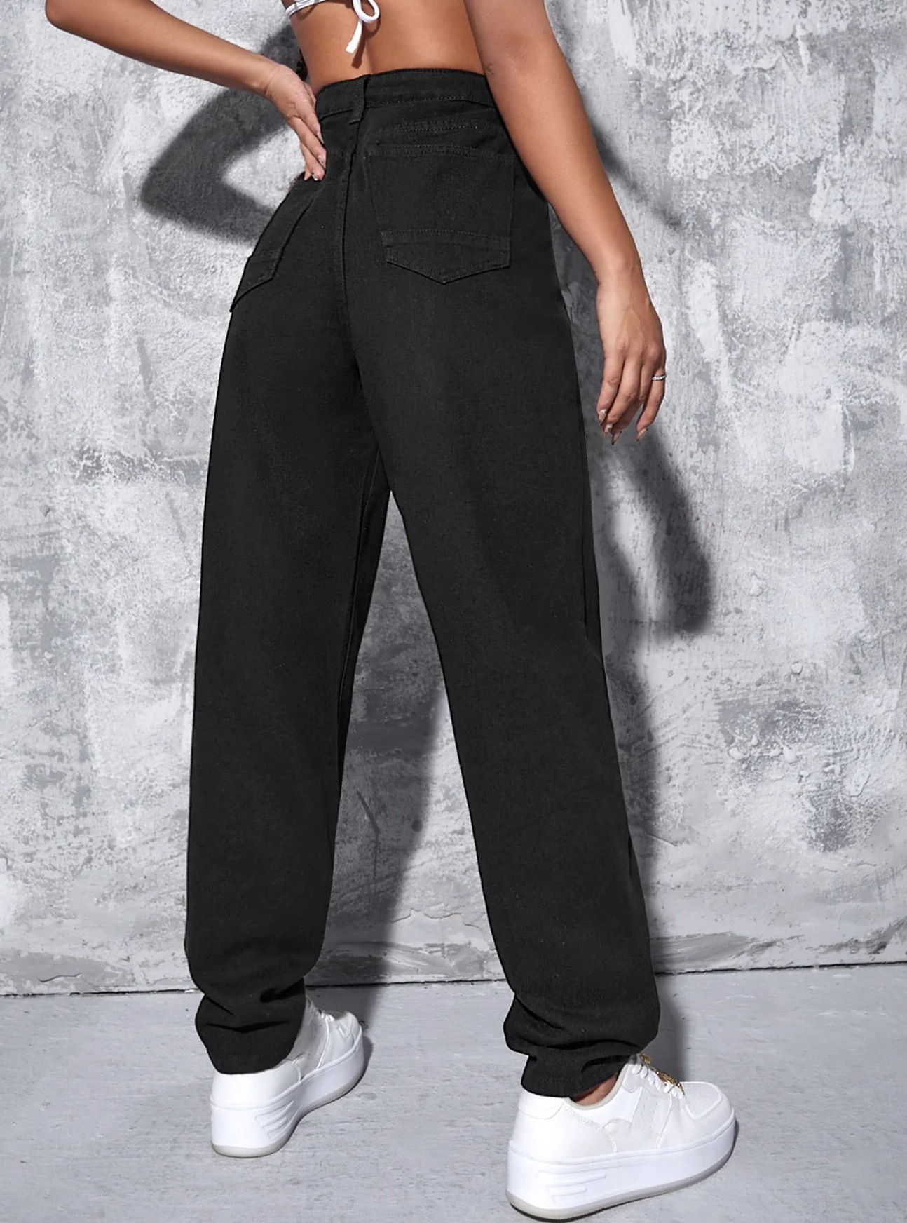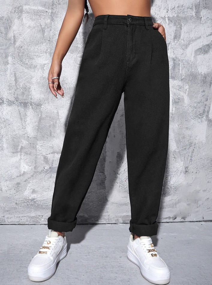Color: Black Details: Button, Pocket, Zipper Composition: Cotton, Polyester Material: Denim Fabric: Non-Stretch Length: Long Waist Line: Natural Sheer: No Pattern Type: Plain Fit Type: Regular Fit Type: Tapered/Carrot Closure Type: Zipper Fly Location: All Users-Romwe: Chill Jeans Style: Mom Fit Fabric Type: Cowboy Care Instructions: Machine wash, do not dry clean Body: Unlined