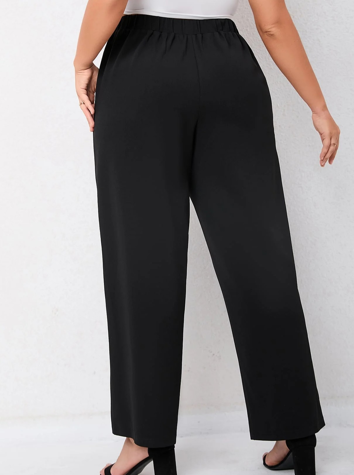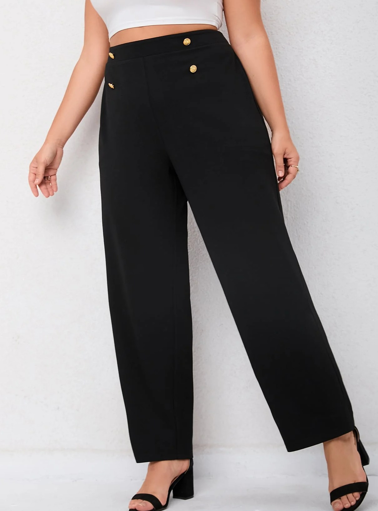 Color: Black Details: Double Button Style: Elegant Material: Fabric Waist Line: High Waist Length: Long Sheer: No Pattern Type: Plain Composition: Polyester, Spandex Fit Type: Regular Fit Type: Straight Leg Season: Summer Location: All Fabric Type: Knitting Fabric: Medium Stretch Body: Unlined Care Instructions: Machine wash or professional dry clean