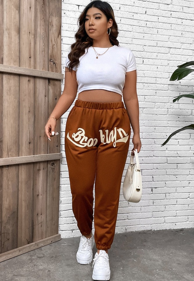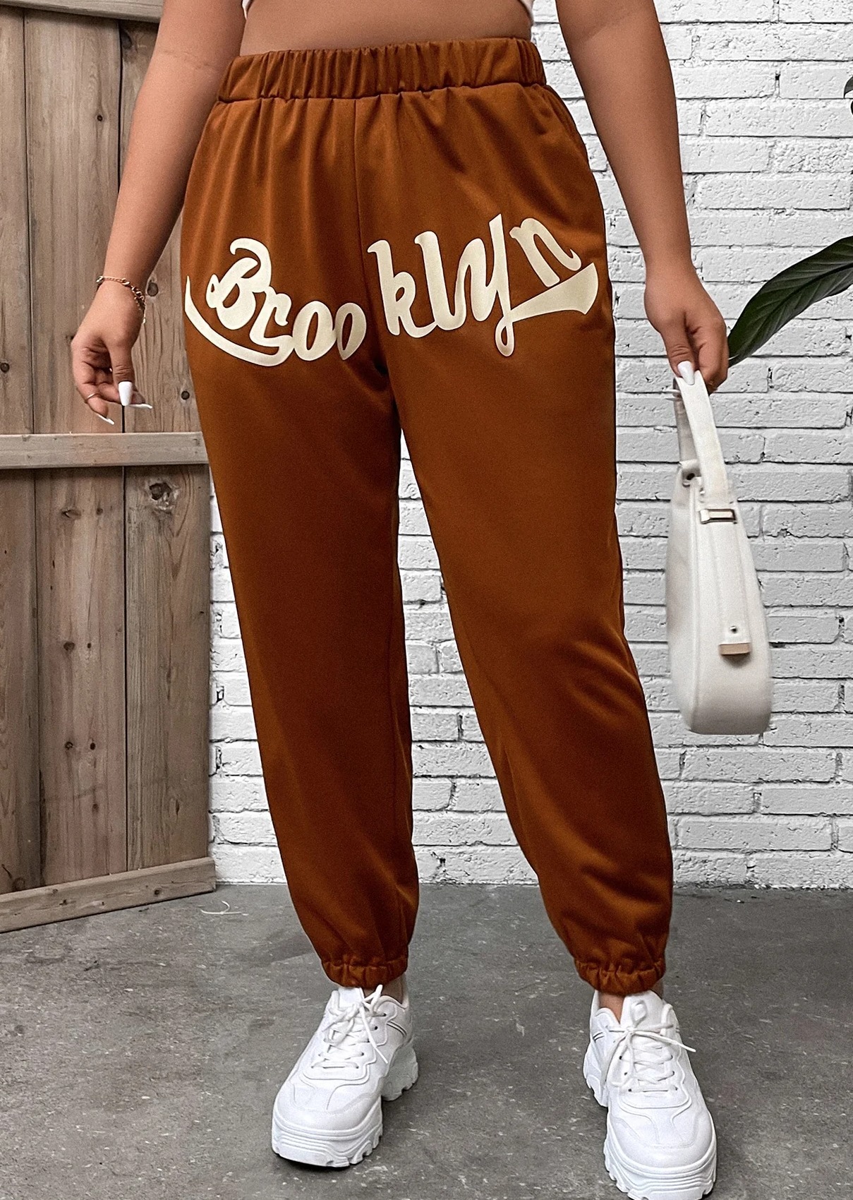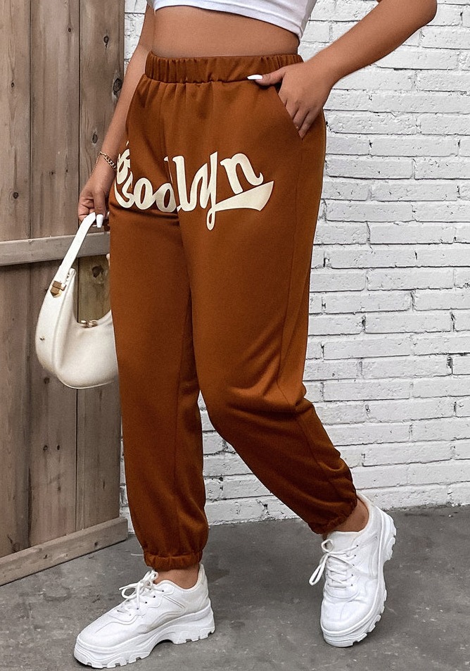 Color: Brown Composition: Elastane, Polyester Closure Type: Elastic Waist Fabric: Slight Stretch Waist Line: High Waist Pattern Type: Letter Length: Long Sheer: No Fit Type: Regular Fit Location: All Type: Jogger Fabric Type: Knitting Body: Unlined Care Instructions: Machine wash or professional dry clean Material: Knitted Fabric