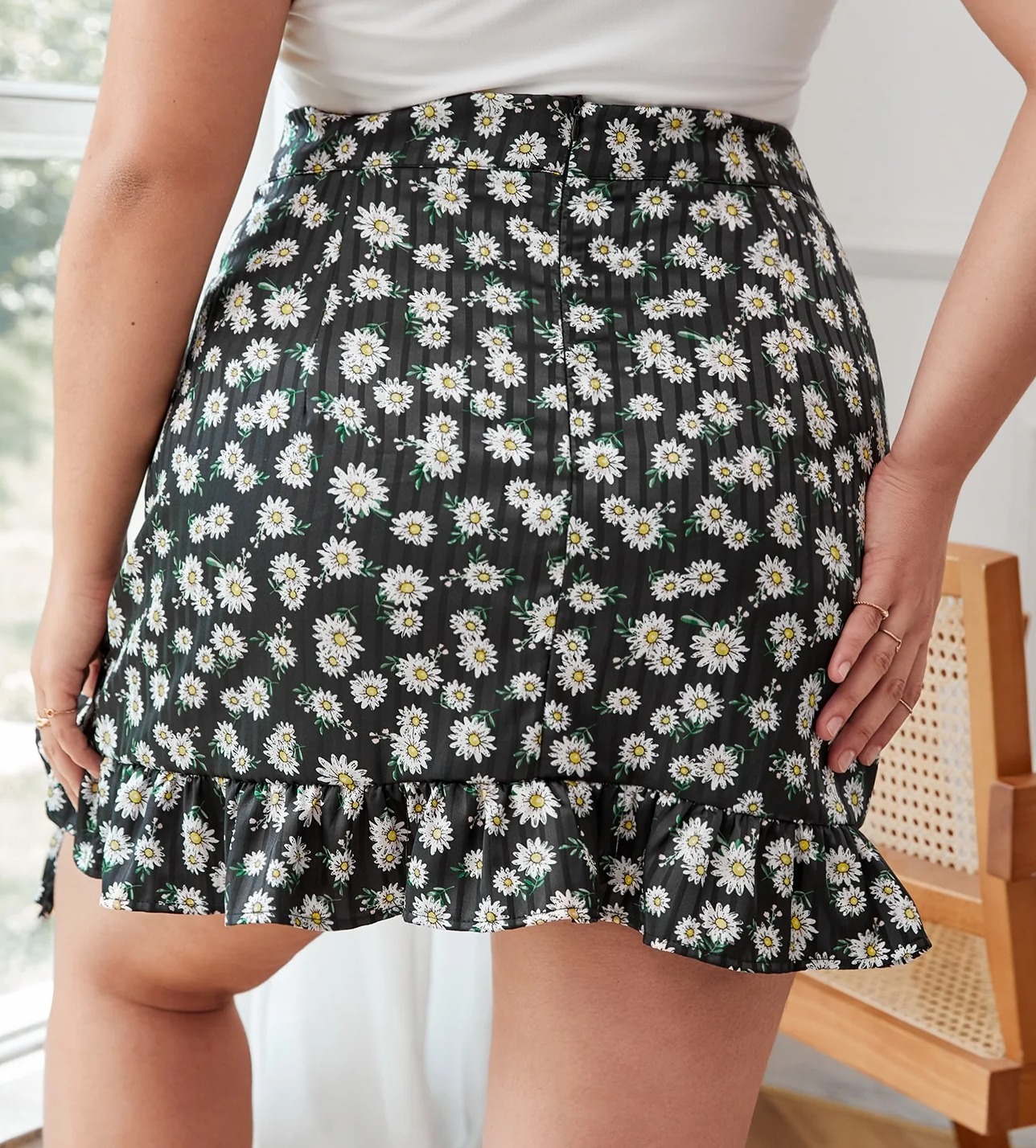 Plus Daisy Print Drawstring Front Ruffle Hem Skirt