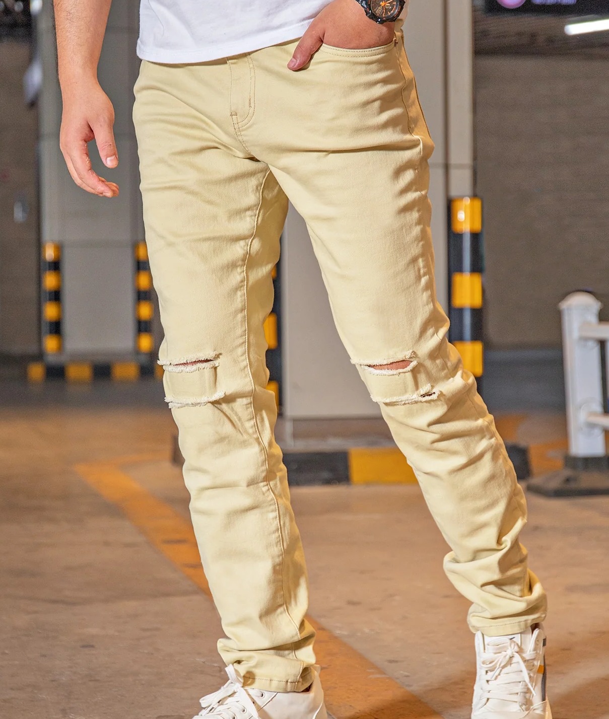 Composition: Cotton, Spandex Material: Denim Color: Khaki Length: Long Waist Line: Natural Sheer: No Pattern Type: Plain Details: Pocket, Ripped, Zipper Fit Type: Regular Fit Closure Type: Zipper Fly Location: All Fabric Type: Cowboy Care Instructions: Machine wash, do not dry clean Fabric: Medium Stretch Body: Unlined Type: Slim Straight