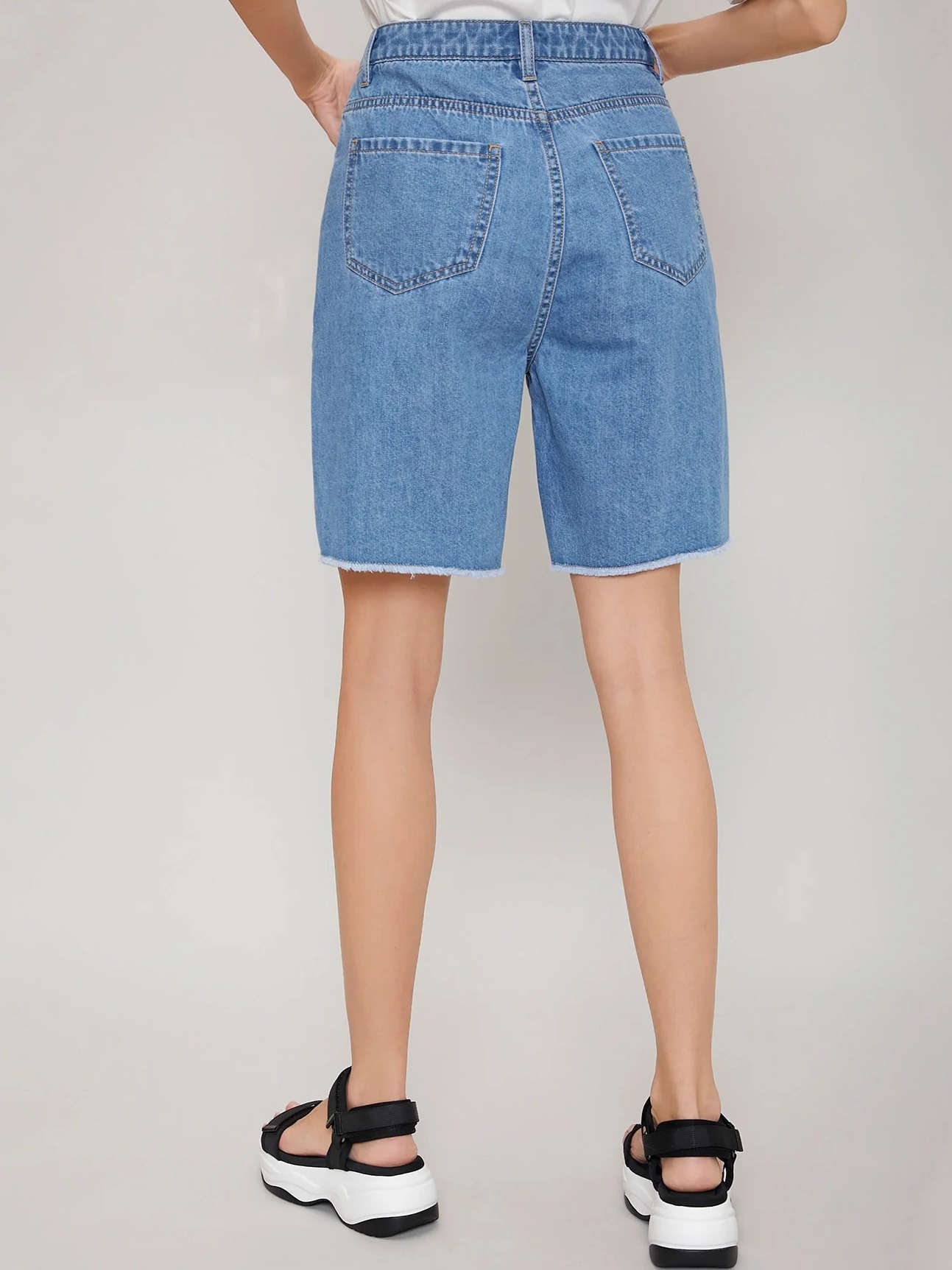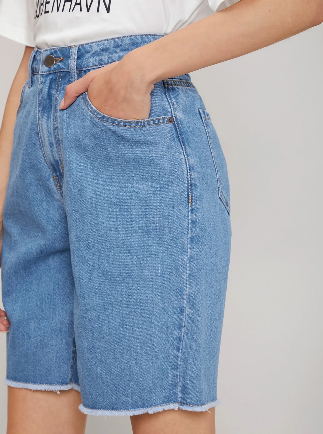 Type: Bermuda Details: Button, Pocket, Raw Hem, Zipper Composition: Cotton Material: Denim Fabric: Non-Stretch Waist Line: High Waist Sheer: No Pattern Type: Plain Fit Type: Regular Fit Length: Short Closure Type: Zipper Fly Location: All Color: Light Wash Fabric Type: Cowboy Care Instructions: Machine wash, do not dry clean