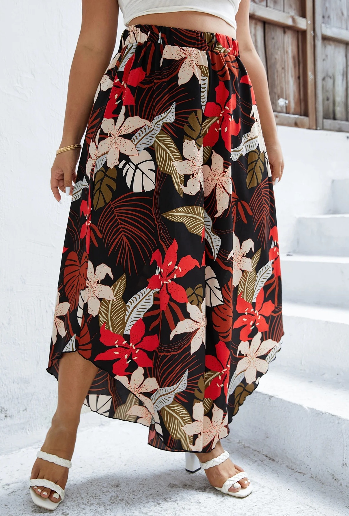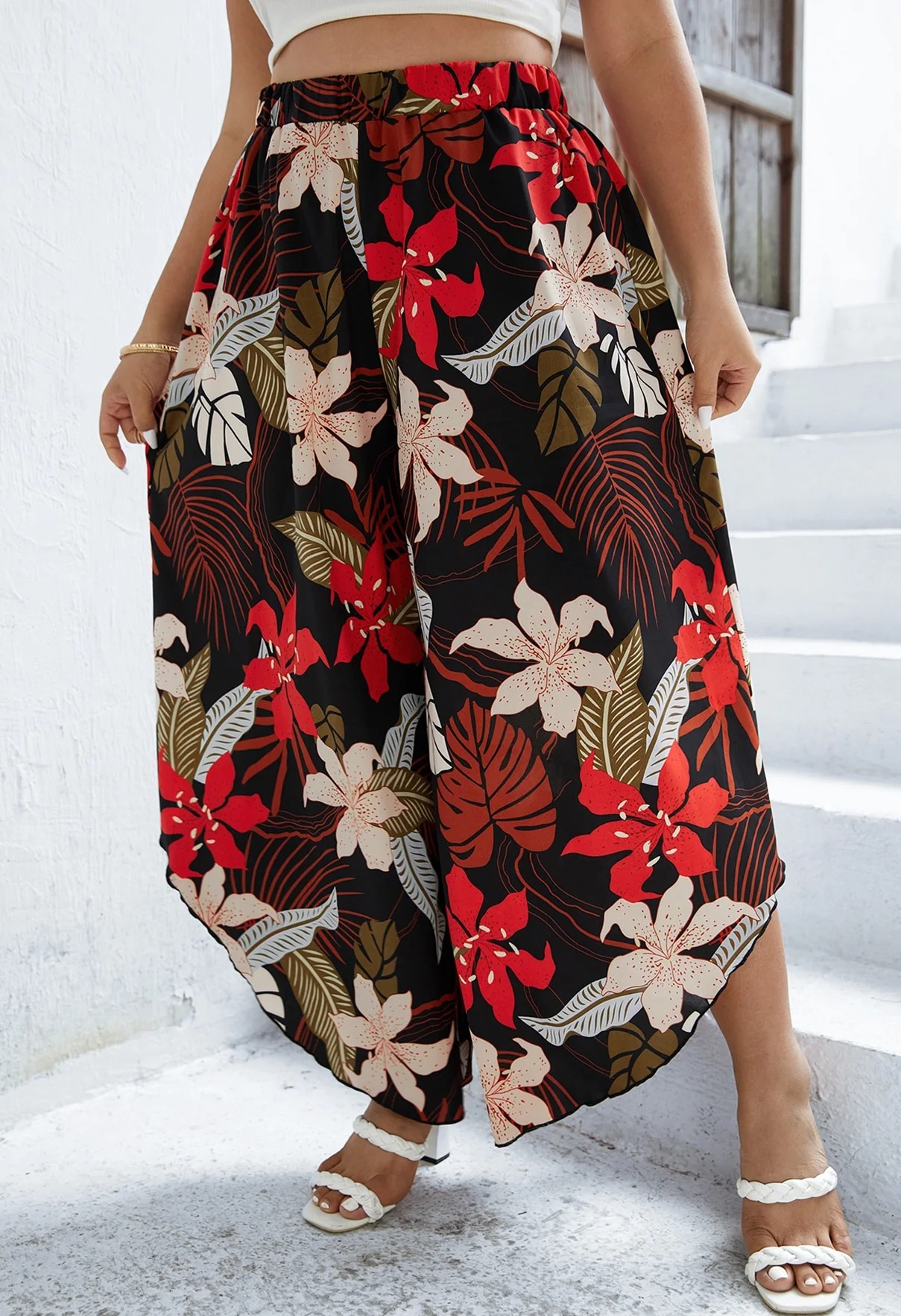Plus Tropical Print Asymmetrical Hem Wide Leg Pants