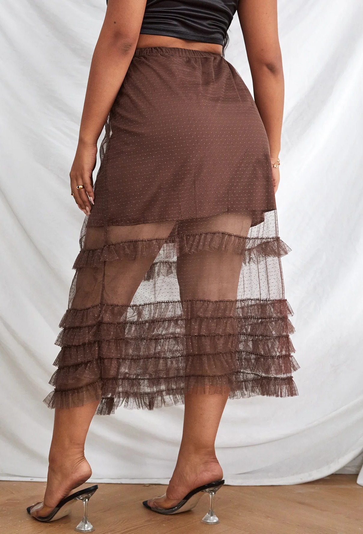 Style: Casual Fabric: Non-Stretch Waist Line: High Waist Type: Layered/Tiered Length: Long Sheer: No Composition: Polyester Fit Type: Regular Fit Details: Ruffle, Tiered Layer Season: Summer Location: All Color: Coffee Brown Fabric Type: Woven Care Instructions: Machine wash or professional dry clean Material: Mesh Fabric