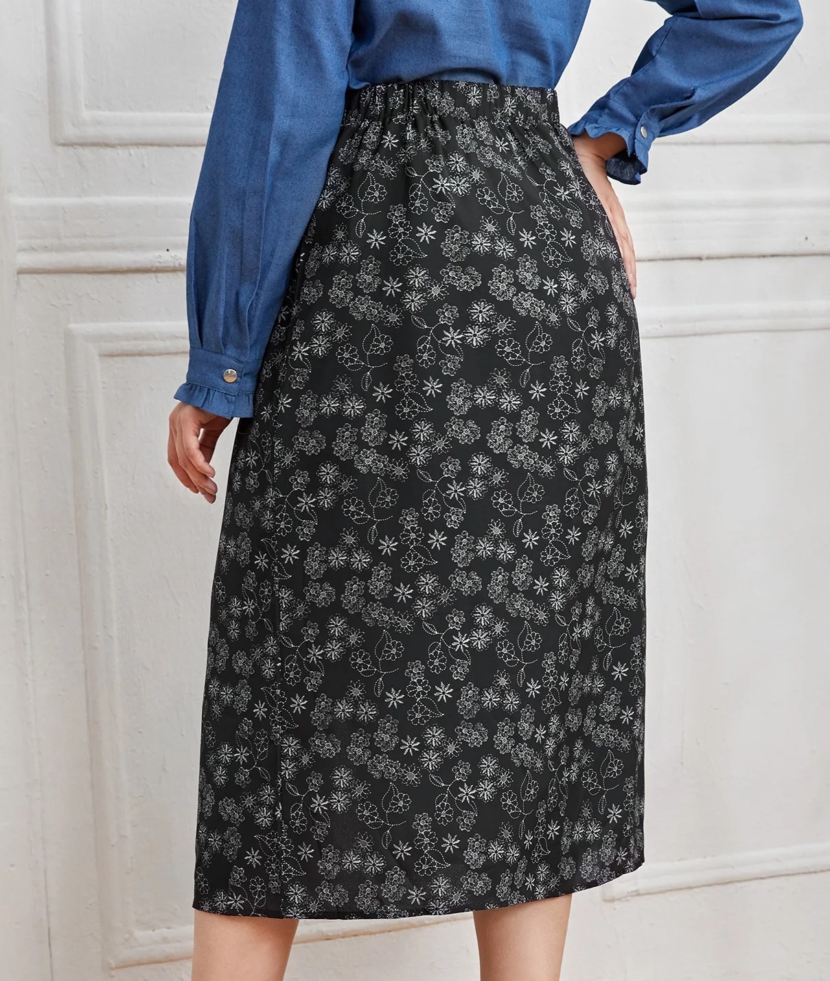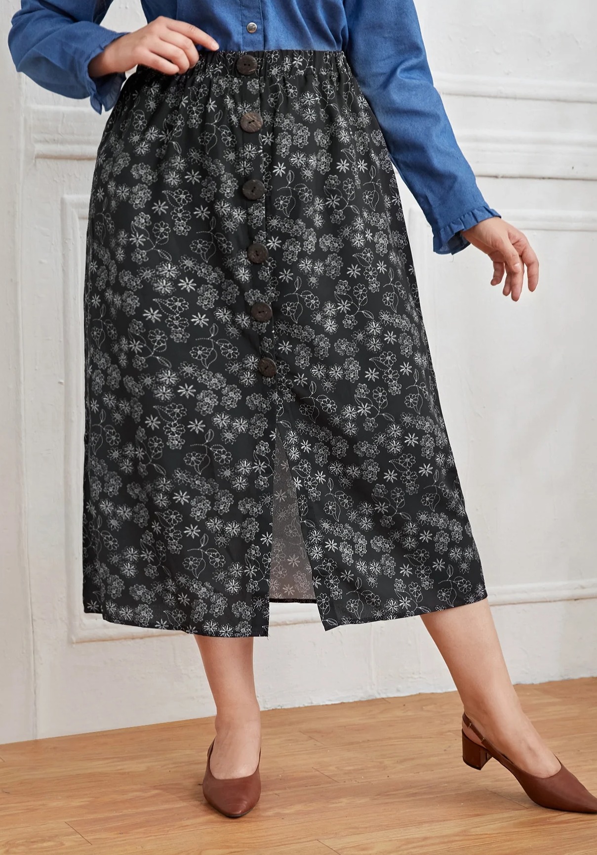Color: Black and White Style: Casual Material: Fabric Fabric: Non-Stretch Waist Line: High Waist Length: Midi Sheer: No Composition: Polyester Fit Type: Regular Fit Type: Slit Pattern Type: Plants Location: FR Season: Spring/Summer/Fall Fabric Type: Woven Details: Fake Buttons Care Instructions: Machine wash or professional dry clean