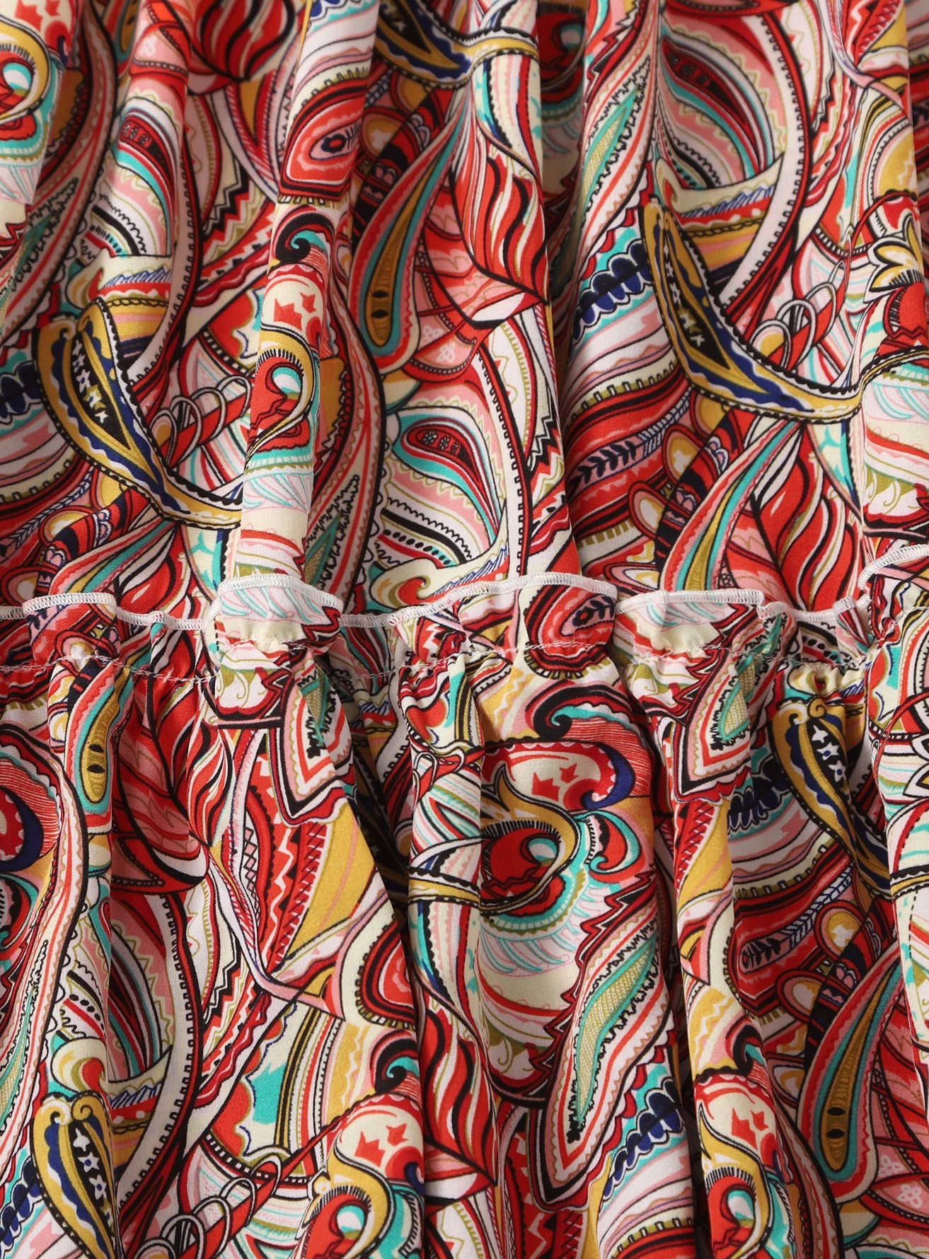 Style: Casual Material: Fabric Fabric: Non-Stretch Waist Line: High Waist Type: Layered/Tiered Color: Multicolor Sheer: No Composition: Polyester Fit Type: Regular Fit Details: Ruffle Hem Length: Short Season: Summer Pattern Type: Tribal Location: AR Fabric Type: Woven Body: Lined Care Instructions: Machine wash or professional dry clean