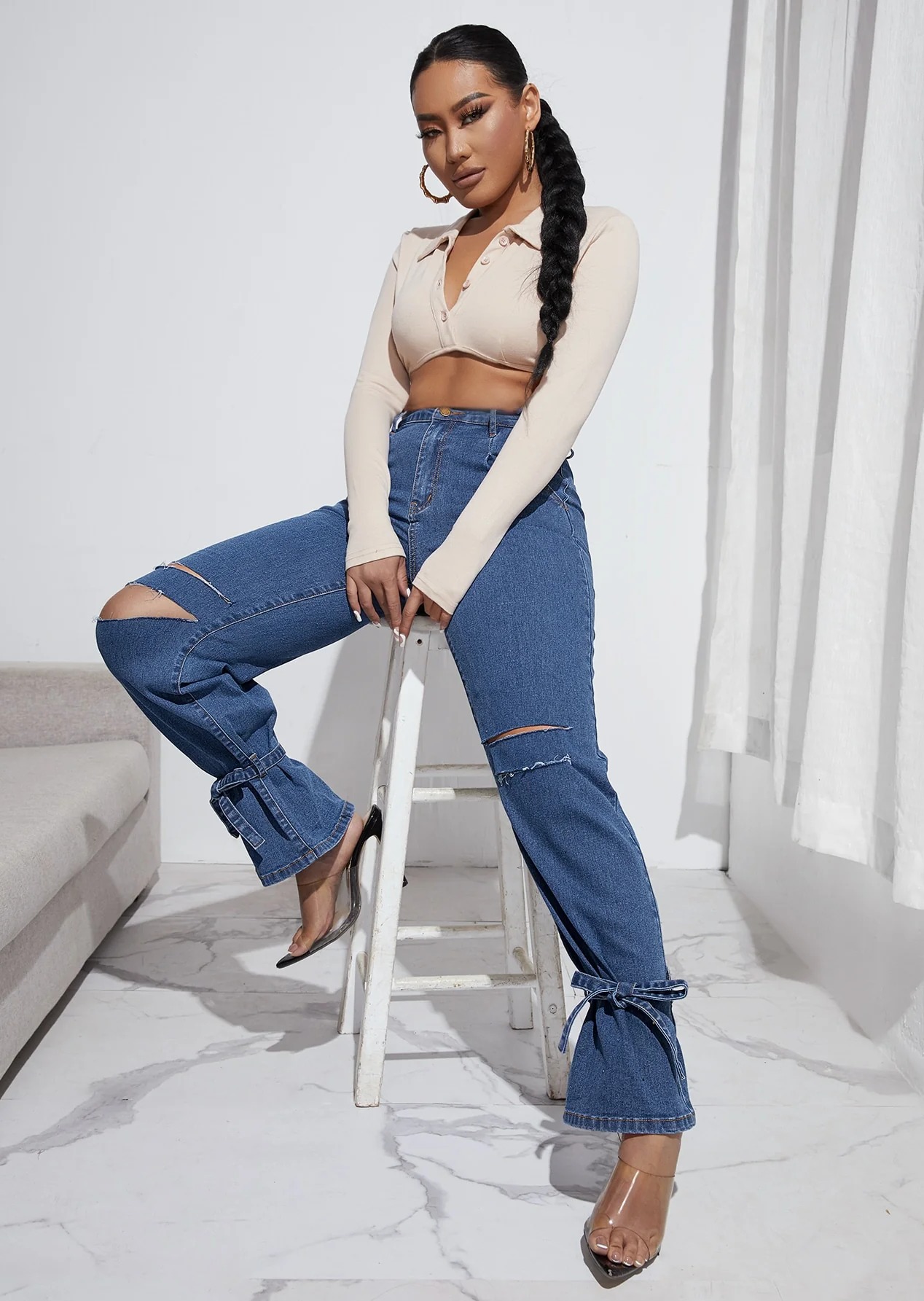 Product InDetails: Button, Pocket, Ripped, Zipper Composition: Cotton, Elastane, Polyester Material: Denim Fabric: High Stretch Type: Flare Leg Waist Line: High Waist Length: Long Sheer: No Pattern Type: Plain Fit Type: Regular Fit Closure Type: Zipper Fly Location: All Color: Medium Wash Fabric Type: Cowboy Care Instructions: Machine wash, do not dry clean Body: Unlined