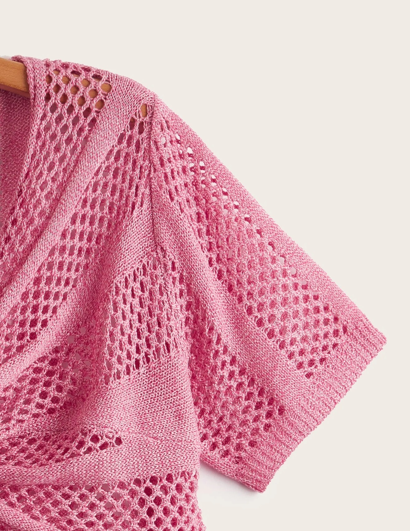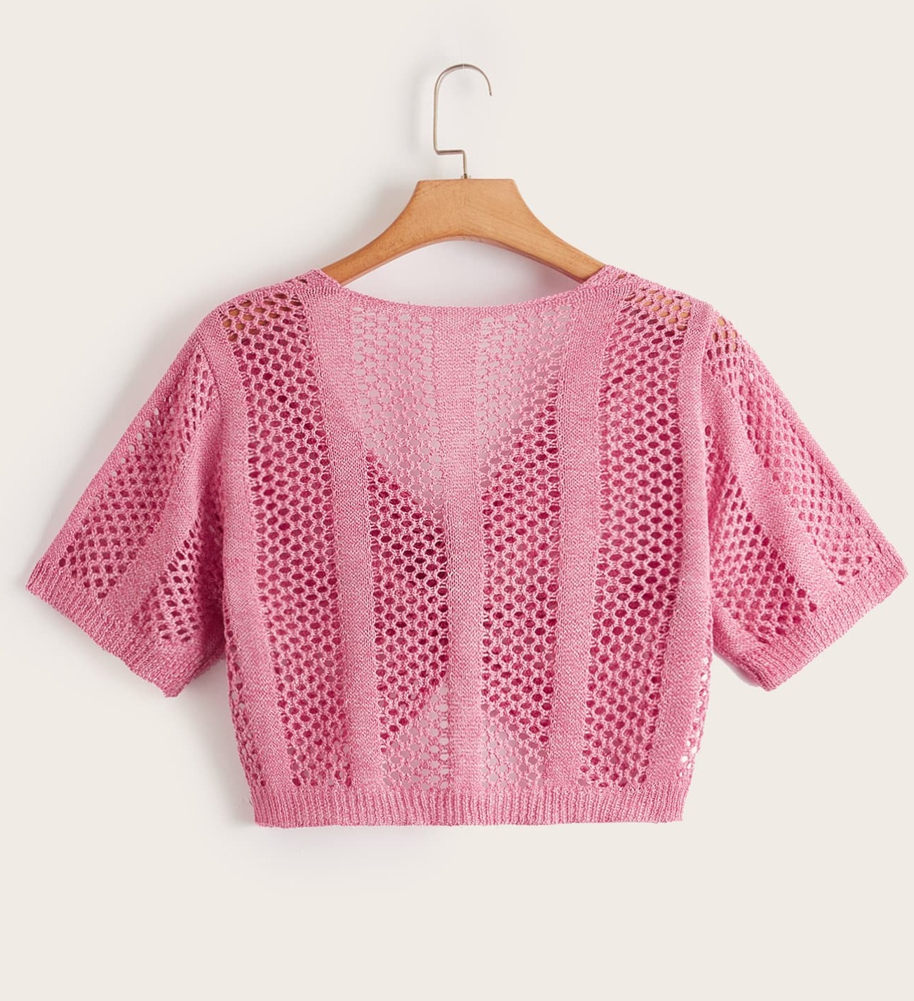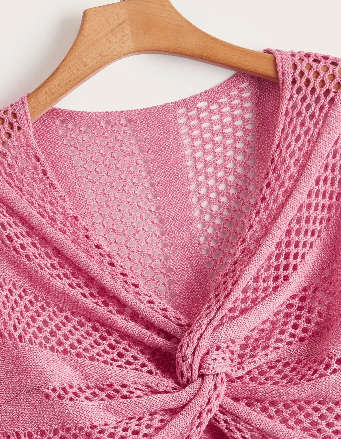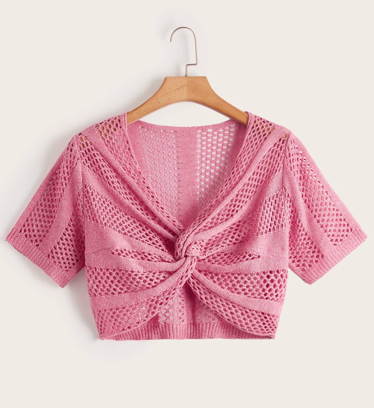 Style: Casual Length: Crop Material: Fabric Fabric: Slight Stretch Color: Pink Pattern Type: Plain Composition: Polyester Placket Type: Pullovers Fit Type: Regular Fit Sleeve Length: Short Sleeve Details: Twist Neckline: V neck Sleeve Type: Regular Sleeve Location: All Fabric Type: Knitwear Sheer: Semi-Sheer Care Instructions: Machine wash or professional dry clean