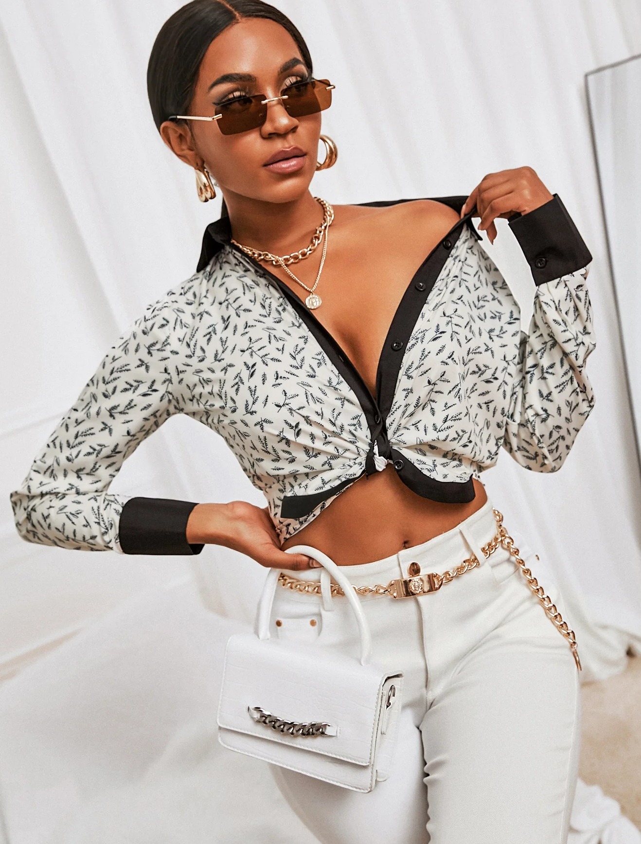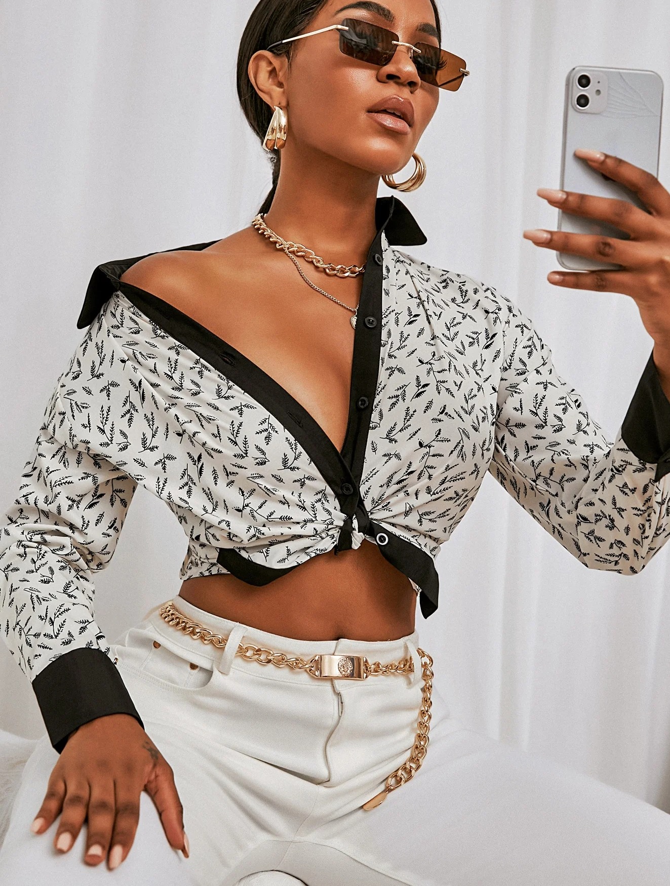 Style: Casual Neckline: Collar Material: Fabric Fabric: Non-Stretch Length: Long Sleeve Length: Long Sleeve Sheer: No Composition: Polyester Fit Type: Regular Fit Type: Shirt Placket: Single Breasted Season: Spring/Fall Color: White Sleeve Type: Regular Sleeve Placket Type: Placket Pattern Type: Plants, All Over Print Details: Contrast Binding, Button Front Location: All Fabric Type: Woven Care Instructions: Machine wash or professional dry clean