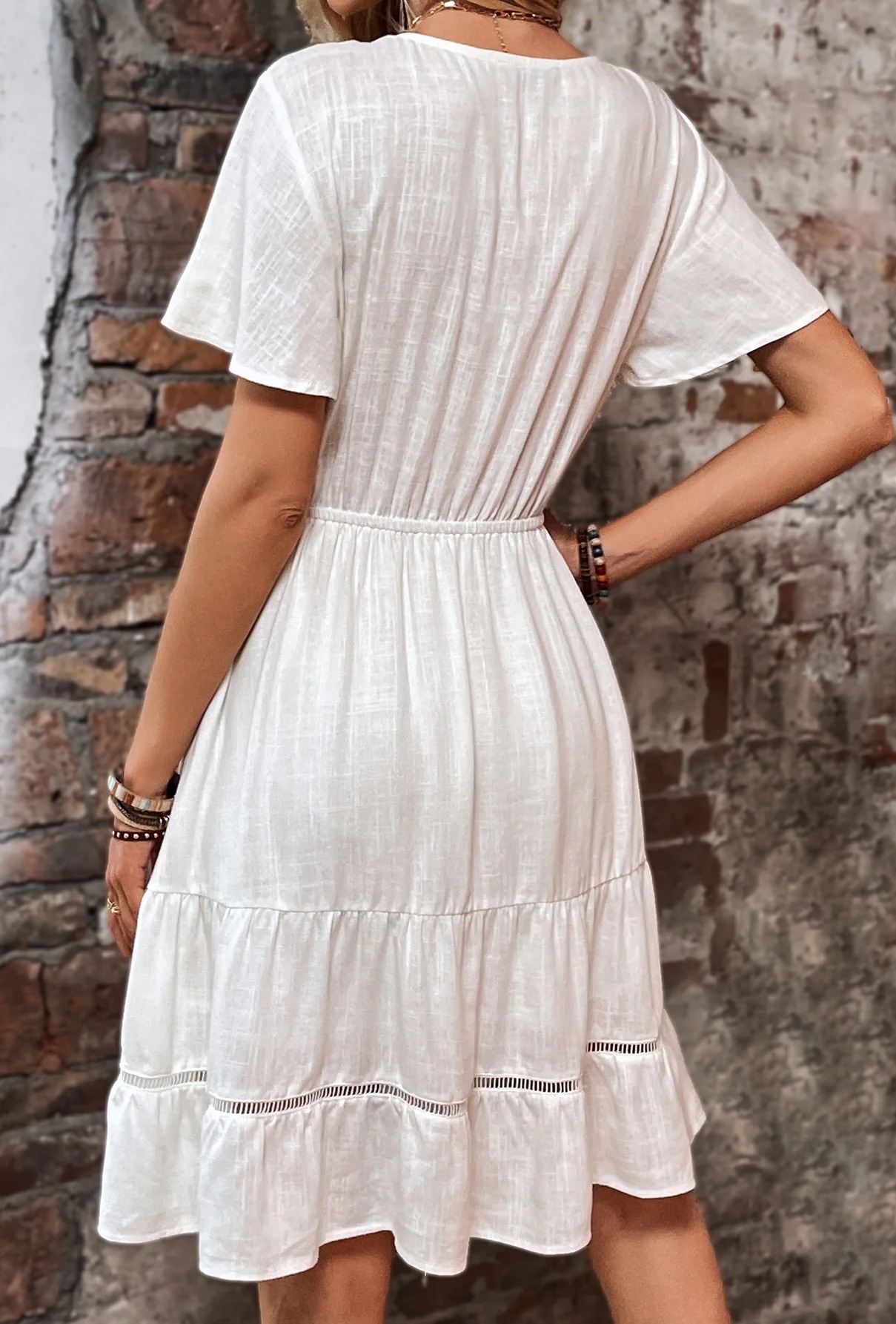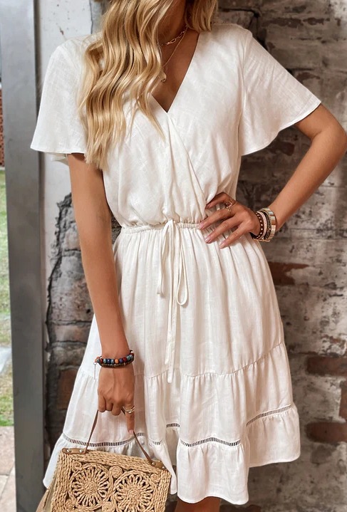 Type: A Line Sleeve Type: Butterfly Sleeve Style: Casual Fabric: Non-Stretch Waist Line: High Waist Hem Shaped: Layered/Tiered Pattern Type: Plain Composition: Polyester Fit Type: Regular Fit Length: Short Sleeve Length: Short Sleeve Details: Tiered Layer, Tie Front Neckline: V neck Color: White Location: All Fabric Type: Woven Care Instructions: Hand wash,do not dry clean Sheer: Semi-Sheer Material: Woven Fabric