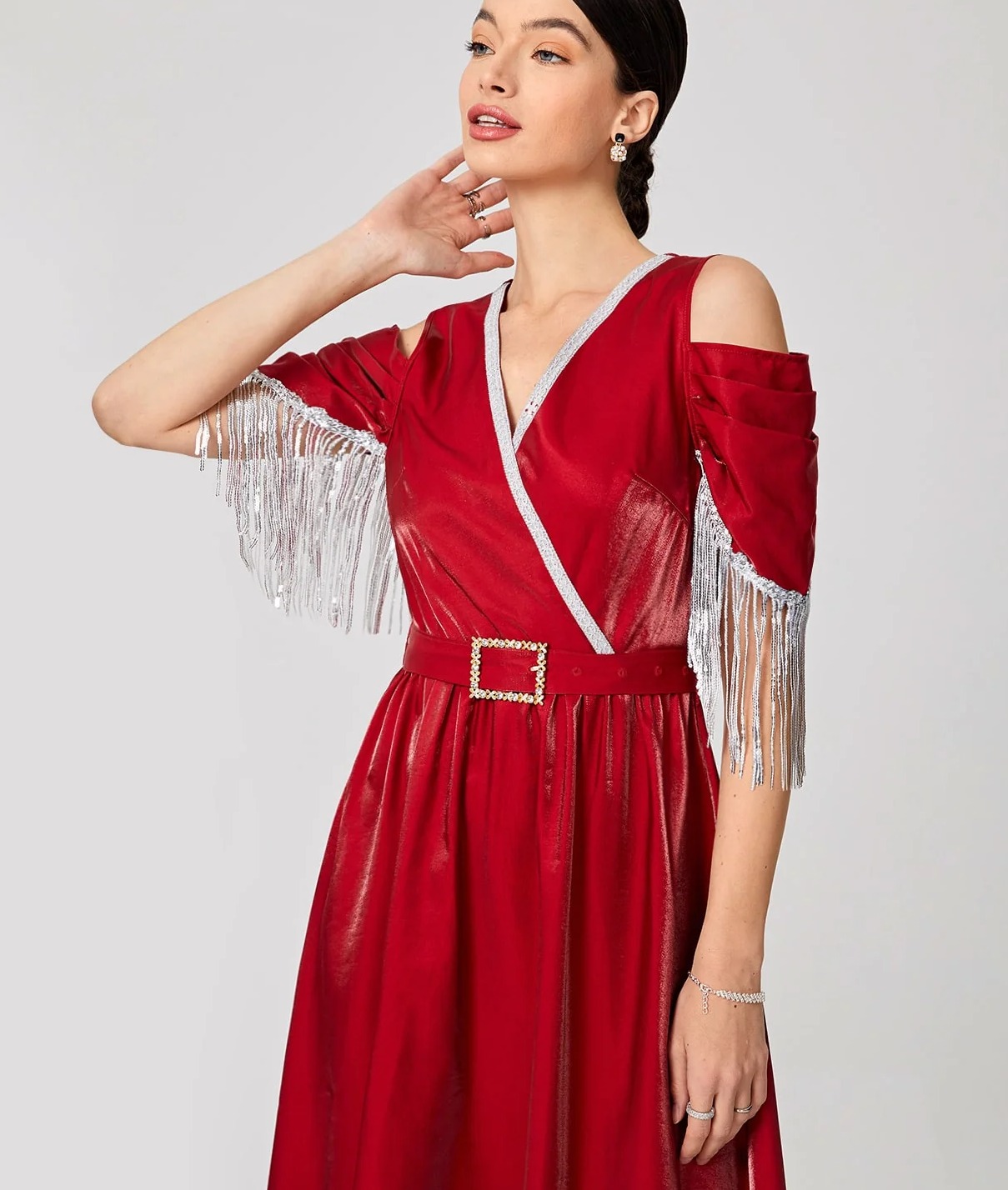 Fringe Trim Cold Shoulder Contrast Binding Belted Dress