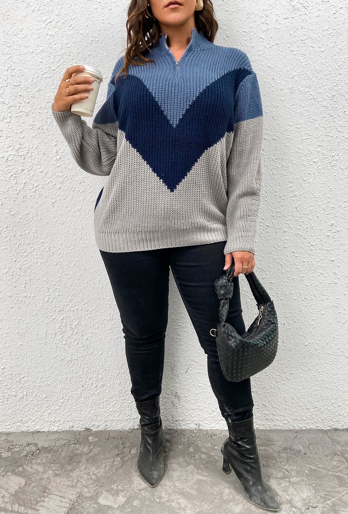 Composition: Acrylic Style: Casual Pattern Type: Chevron, Colorblock Material: Knit Sleeve Length: Long Sleeve Color: Multicolor Sheer: No Type: Pullovers Length: Regular Fit Type: Regular Fit Neckline: Stand Collar Details: Zipper Placket Type: Half Placket Location: All Sleeve Type: Drop Shoulder Fabric Type: Knitwear Fabric: Medium Stretch Care Instructions: Machine wash or professional dry clean