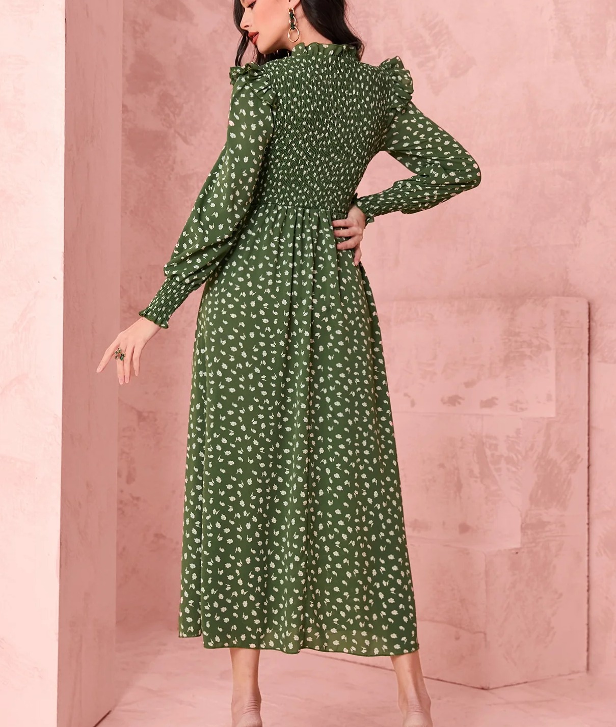 Type: A Line Style: Elegant Material: Fabric Fabric: Non-Stretch Hem Shaped: Flared Details: Frill, Ruffle, Shirred Waist Line: High Waist Length: Long Sleeve Length: Long Sleeve Color: Multicolor Sheer: No Composition: Polyester Sleeve Type: Puff Sleeve Fit Type: Regular Fit Season: Spring/Fall Neckline: Stand Collar Pattern Type: Ditsy Floral Location: AR Fabric Type: Woven Care Instructions: Machine wash or professional dry clean