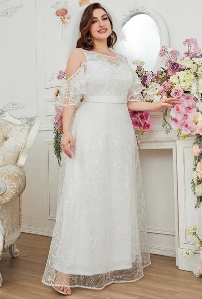 Plus Cold Shoulder Lace Wedding Dress Without Veil