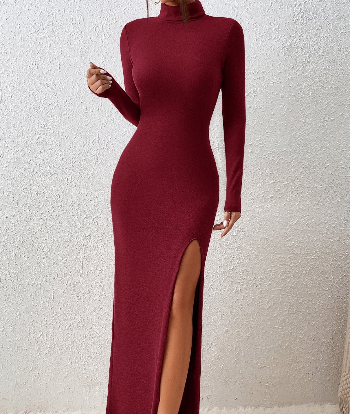 Type: Bodycon Style: Casual Composition: Elastane, Polyester Material: Fabric Fabric: High Stretch Neckline: High Neck Sleeve Length: Long Sleeve Length: Maxi Waist Line: Natural Pattern Type: Plain Color: Red Fit Type: Slim Fit Sleeve Type: Regular Sleeve Hem Shaped: Slit Details: Split Thigh Location: All Fabric Type: Knitting Sheer: Semi-Sheer Care Instructions: Machine wash or professional dry clean