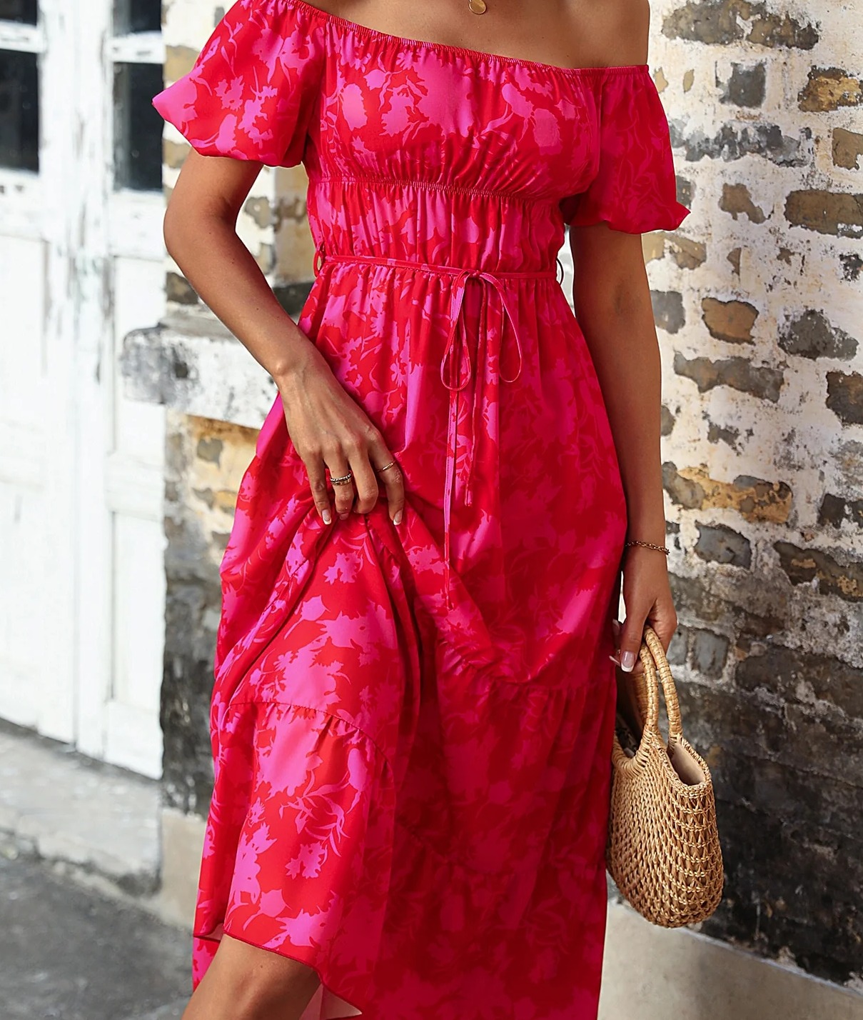 Type: A Line Composition: Elastane, Polyester Fabric: Non-Stretch Pattern Type: Floral Waist Line: High Waist Color: Hot Pink Length: Long Sheer: No Neckline: Off the Shoulder Sleeve Type: Puff Sleeve Fit Type: Regular Fit Details: Ruffle Hem, Tie Front Sleeve Length: Short Sleeve Style: Boho Hem Shaped: Flounce Location: All Fabric Type: Woven Care Instructions: Machine wash or professional dry clean Material: Woven Fabric
