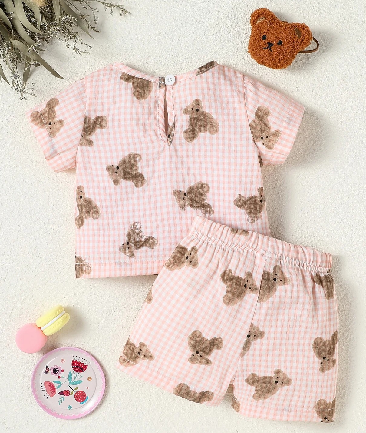 Details: Button Pattern Type: Cartoon, Gingham Fabric: Slight Stretch Color: Multicolor Sheer: No Fit Type: Regular Fit Neckline: Round Neck Sleeve Length: Short Sleeve Top Type: Tee Sleeve Type: Regular Sleeve Bottom Type: Track Shorts Location: All Care Instructions: Machine wash, do not dry clean Number of Pieces: 2 Piece Set
