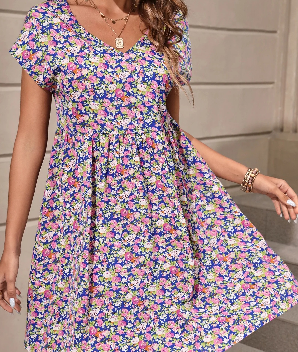 Sleeve Type: Batwing Sleeve Composition: Elastane, Polyester Fabric: Non-Stretch Hem Shaped: Flared Pattern Type: Floral, All Over Print Waist Line: High Waist Color: Multicolor Sheer: No Fit Type: Regular Fit Length: Short Sleeve Length: Short Sleeve Neckline: V neck Style: Boho Type: Smock Location: All Fabric Type: Woven Care Instructions: Machine wash or professional dry clean Material: Woven Fabric