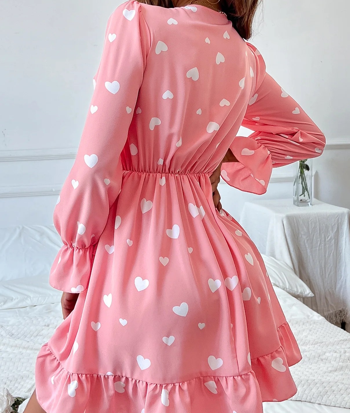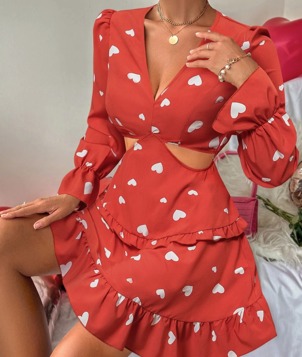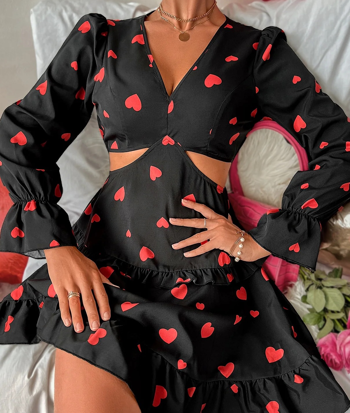 Heart Print Cut Out Waist Ruffle Hem Dress