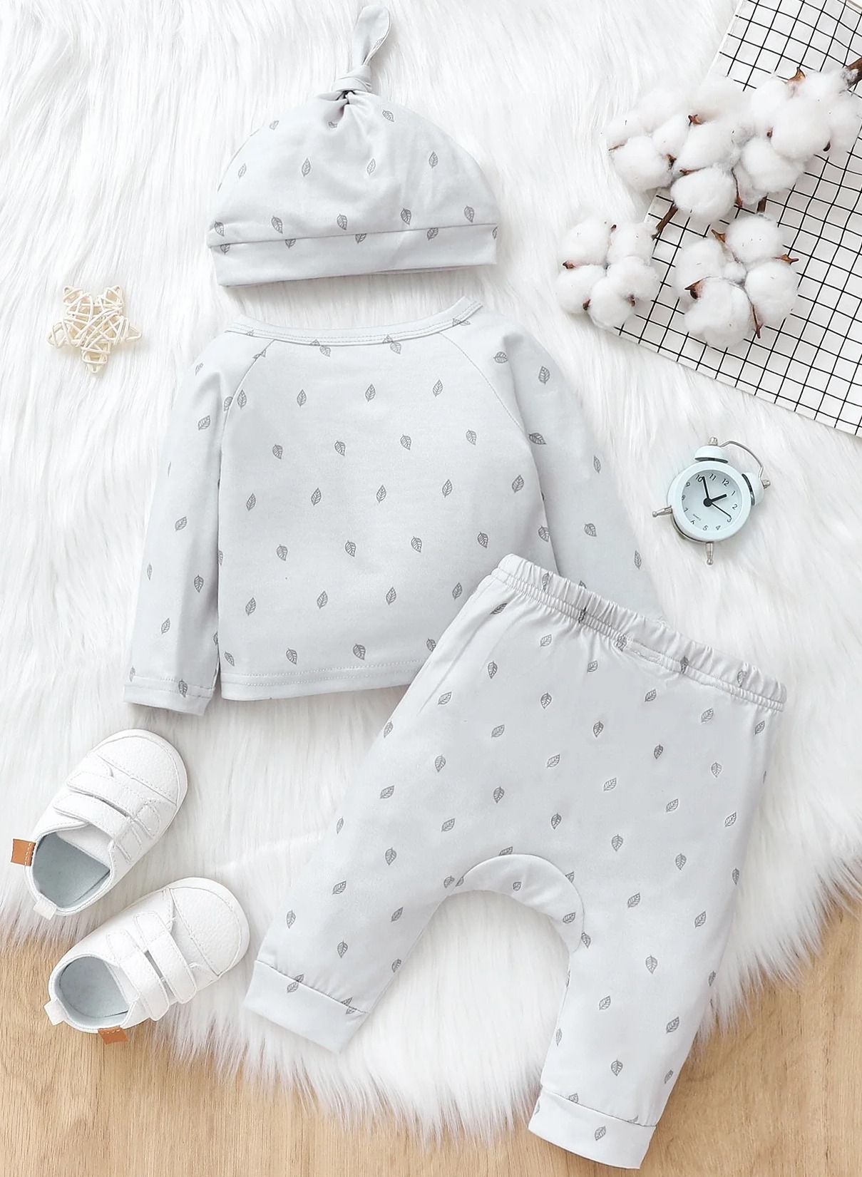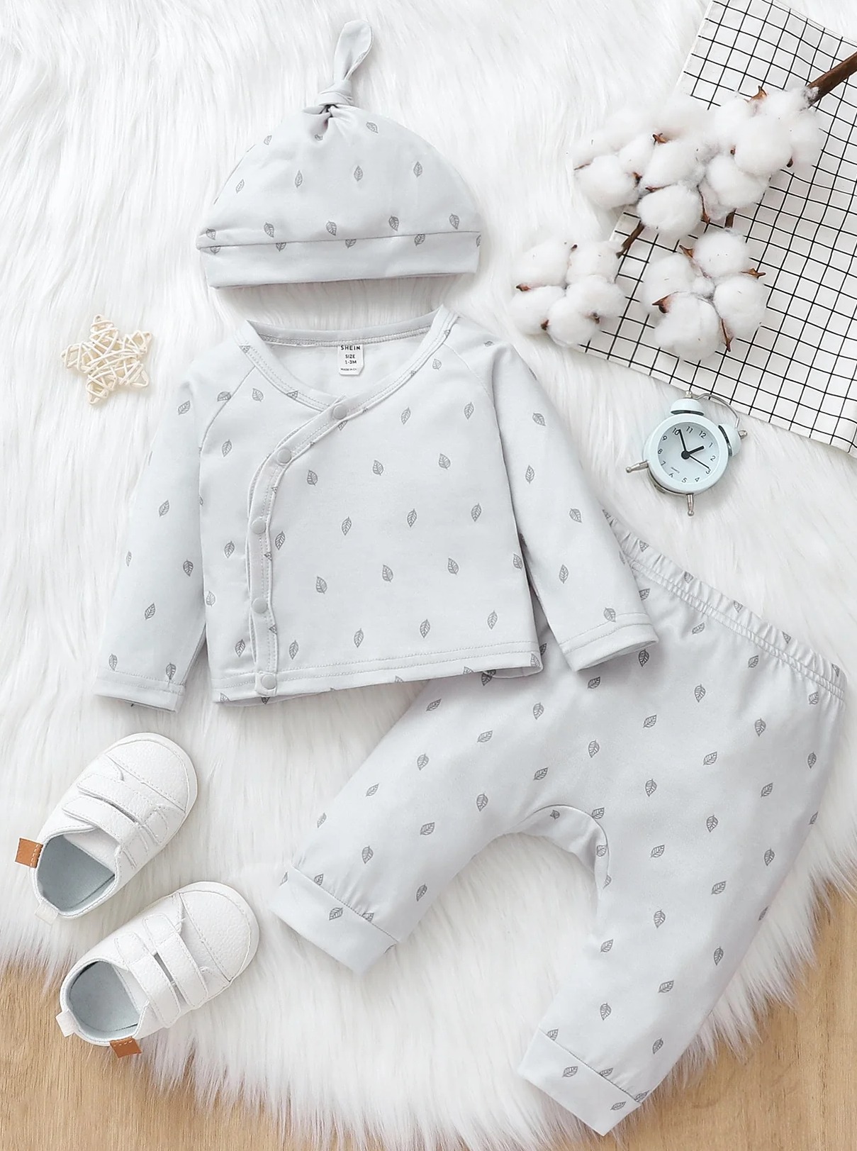 Baby Leaves Print Button Front Top & Pants & Hat