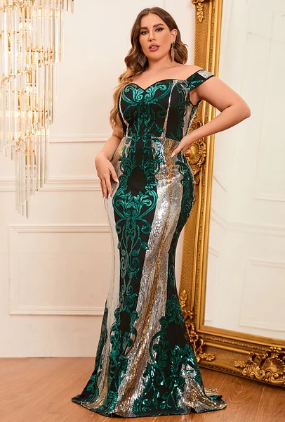 Type: Bodycon Pattern Type: Colorblock Details: Contrast Sequin, Zipper Waist Line: High Waist Length: Maxi Sheer: No Neckline: Off the Shoulder Composition: Polyester Lining: Polyester Material: Sequins Sleeve Length: Short Sleeve Fit Type: Slim Fit Hem Shaped: Mermaid Location: All Style: Party Color: Dark Green Fabric Type: Woven Care Instructions: Hand wash,do not dry clean Fabric: Medium Stretch Body: Lined