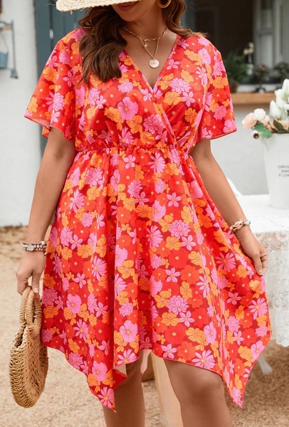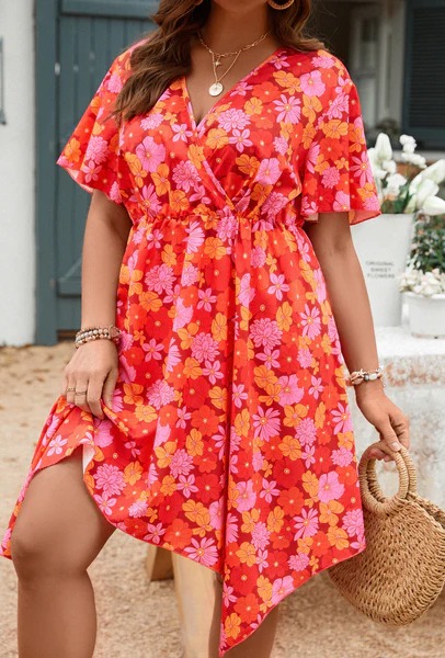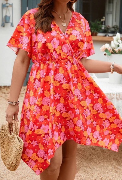 Type: A Line Details: Asymmetrical, Wrap Hem Shaped: Asymmetrical Sleeve Type: Butterfly Sleeve Fabric: Non-Stretch Pattern Type: Floral, All Over Print Waist Line: High Waist Length: Knee Length Sheer: No Composition: Polyester Color: Red Fit Type: Regular Fit Sleeve Length: Short Sleeve Neckline: V neck Style: Boho Location: All Fabric Type: Woven Care Instructions: Machine wash, do not dry clean,wash with the soft detergent Material: Woven Fabric