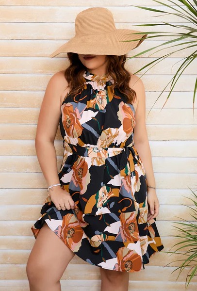 Plus Floral Print Belted Halter Neck Dress