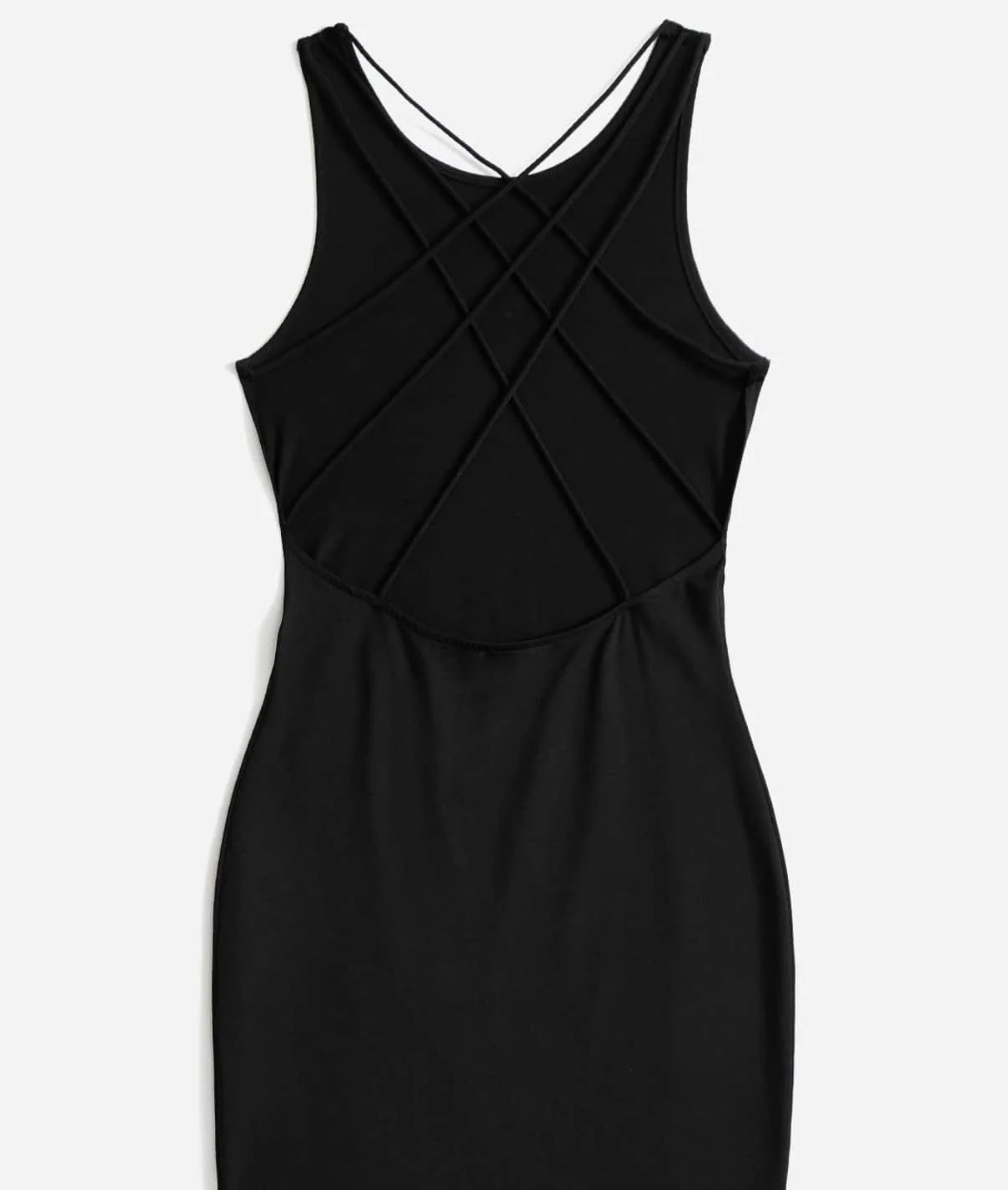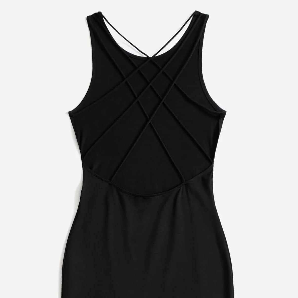 Details: Backless, Criss Cross Color: Black Composition: Elastane, Polyester Fabric: Slight Stretch Waist Line: Natural Sheer: No Hem Shaped: Pencil Pattern Type: Plain Neckline: Round Neck Style: Sexy Length: Short Sleeve Length: Sleeveless Fit Type: Slim Fit Type: Tank Location: All Fabric Type: Knitting Care Instructions: Machine wash or professional dry clean Material: Knitted Fabric