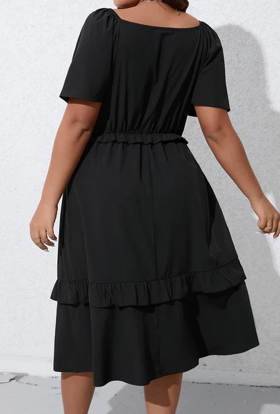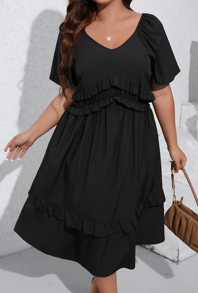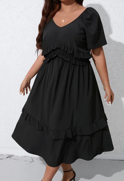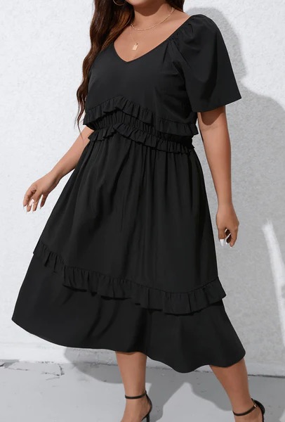 Type: A Line Color: Black Style: Casual Material: Fabric Fabric: Non-Stretch Details: Frill, Ruffle, Ruffle Hem Waist Line: High Waist Length: Long Sheer: No Pattern Type: Plain Composition: Polyester Sleeve Type: Raglan Sleeve Fit Type: Regular Fit Sleeve Length: Short Sleeve Neckline: V neck Hem Shaped: Flounce Location: All Fabric Type: Woven Care Instructions: Machine wash or professional dry clean