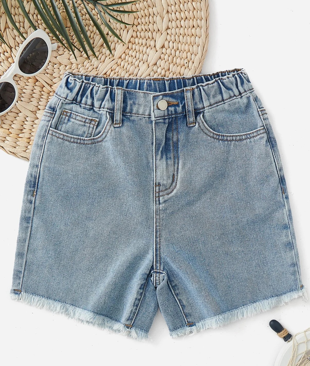 Composition: Cotton, Polyester, Viscose Material: Denim Fabric: Non-Stretch Waist Line: Natural Sheer: No Pattern Type: Plain Details: Pocket, Raw Hem Fit Type: Regular Fit Type: Straight Leg Closure Type: Zipper Fly Location: All Color: Light Wash Fabric Type: Cowboy Care Instructions: Machine wash or professional dry clean Length: Bermuda shorts