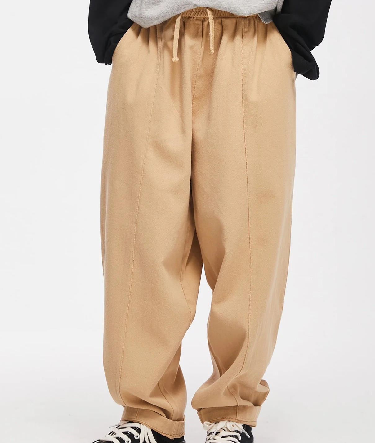 Style: Casual Composition: Cotton Details: Drawstring, Pocket Closure Type: Drawstring Waist Material: Fabric Fabric: Slight Stretch Color: Khaki Length: Long Fit Type: Loose Waist Line: Natural Sheer: No Pattern Type: Plain Type: Straight Leg Pockets: Yes Location: All Season: Spring/Summer/Fall Fabric Type: Woven Body: Unlined Care Instructions: Machine wash or professional dry clean