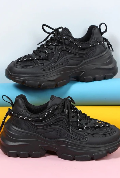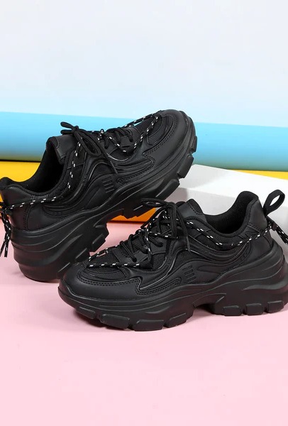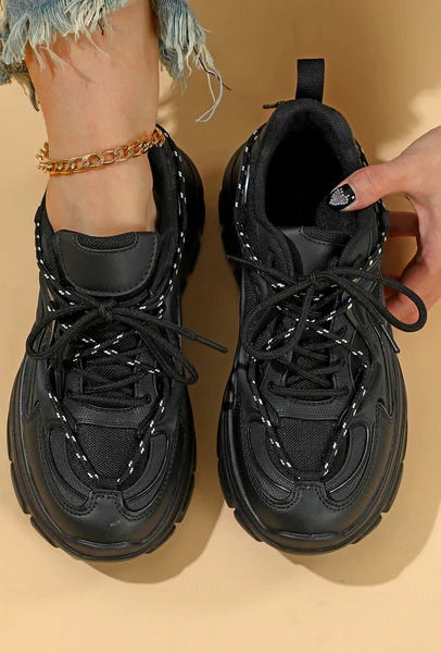 Sporty Black Chunky Shoes For Women, Patch Decor Lace Up Sneakers